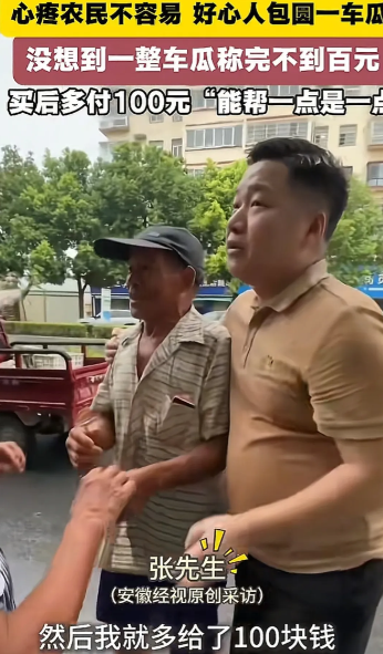 河南,男子不想让卖瓜老夫妻淋雨,包圆了一车西瓜,谁知西瓜3毛钱一斤,一整车才98元,男子于心不忍,又掏出钱包说:“再给100!” "出门在外都不容易,能帮一手是一手!"男子感慨道,这句话背后,是一个发生在河南的暖心故事。 那是一个阴雨绵绵的下午,河南某地街头,一对年迈的夫妻正守着一车西瓜焦急张望,雨水打湿了他们的衣衫,却淋不灭他们眼中对生活的期盼,就在这时一位路过的男子停下了脚步,他看着这对在雨中坚守的老人,心中涌起一股酸楚。 没有过多犹豫,他上前问道:"大爷大妈,这车西瓜我全要了!"老夫妻闻言又惊又喜,连忙开始称重计算,当老夫妻报出"3毛钱一斤,总共98元"的价格时,男子愣住了。 在这个物价飞涨的时代,一整车西瓜竟然不到百元,这让他意识到老夫妻的生计何等艰难,看着他们布满皱纹的脸上露出的感激笑容,男子于心不忍,又从钱包里掏出100元递过去:"这钱您拿着,赶紧回家吧,别淋雨生病了,"老夫妻颤抖着接过钱,连声道谢,眼眶湿润。 这一幕被路人拍下并传到网络,迅速引发热议,许多网友被男子的善举感动,纷纷点赞,有网友评论:"现在这样善良的人不多了,他不仅买了西瓜,更是给了老人尊严和温暖。" 另一位网友则说:"98元对很多人来说可能只是一顿饭钱,但对这对老夫妻来说,可能是好几天的生计,男子的额外100元,是雪中送炭啊!" 这个故事让我们看到,在快节奏的现代生活中,依然有人愿意停下脚步,为陌生人伸出援手,男子的举动不仅帮助了老夫妻,也温暖了无数网友的心。 生活中,我们或许无法像这位男子一样买下整车西瓜,但我们可以从小事做起,给需要帮助的人一点温暖,因为在这个世界上,每个人都可能遇到困难,而善意就像接力棒,传递下去就能照亮更多人的路。 对此你怎么看?欢迎大家在评论区留言讨论。