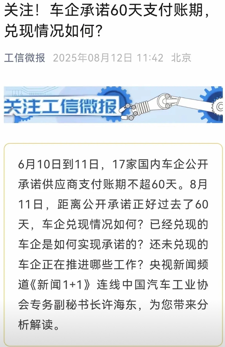 【关于工信部要求车企账期缩短为60天,跟进调查结果官方通报记录来了,看看少了谁?】 到底是谁在阳奉阴违? 到底是谁在顶风作案? 到底是谁在压榨供应商的血汗? 到底是谁整天满天吹牛逼世界第一? 大家仔细一看,就知道是谁了! 是的,你猜对了,就是那个全网出现频率最高的那个。 就是那个全网水军最多的那个。 就是那个法务部最忙的那个,忙于消除真实声音的那个。