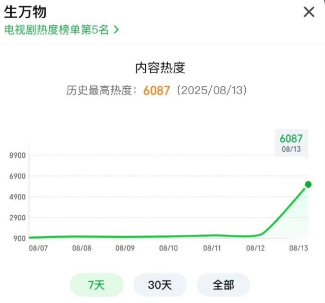 杨幂自带2广,站内热度6000,爱奇艺今年站内首日热度最高是《书卷一梦》的7687,第五名是李兰迪的《朝雪录》,首日热度7462,《生万物》年榜第六,连更11天,超点完结。