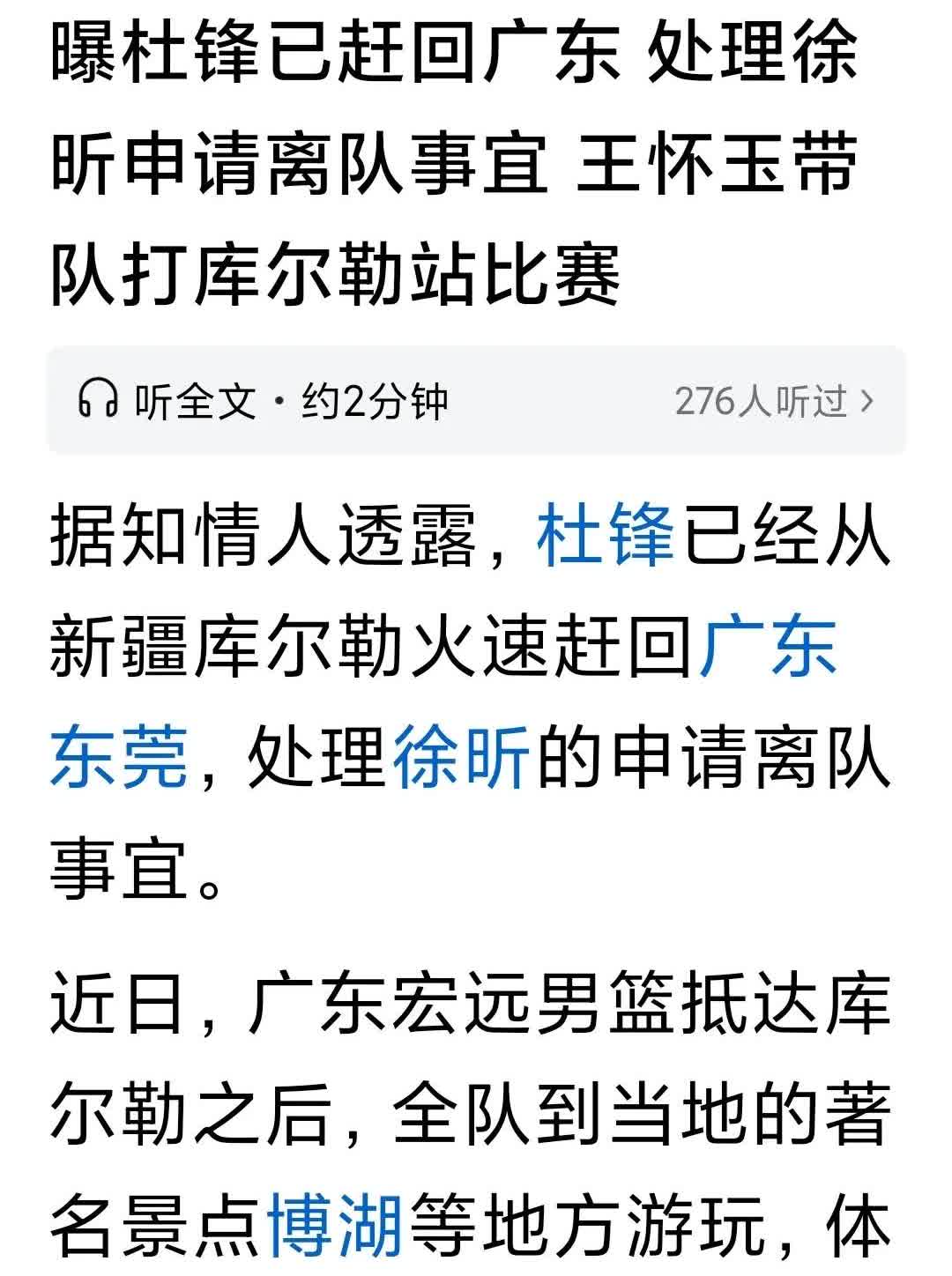 广东队主教练杜锋今日已飞抵新疆! 杜锋今天已经离开广东,下午五点几飞抵新疆,继续帶队征战库尔勒站夏联比赛。有球迷朋友偶遇杜锋,并拍发了与杜指导的合照。 今天有自媒体发文称,杜锋从新疆回到广东,是处理徐昕申请交易转会的事情,广东队将由王怀玉带队征战库尔勒的比赛。这纯粹就是一本正经的胡说八道!球员申请转会不是主教练杜锋的工作范畴,是俱乐部总经理朱芳雨的工作范畴。怎么可熊由杜锋去处理呢?杜锋今次飞返广东,是出席2025“锋基金”青少年篮球交流赛“恩平篮球之夜“活动。而昨晚活动结束后,杜锋今天就赶回新疆。助教王怀玉根本就没有随队出征新疆,在新疆的夏联赛,广东队的首席助教是任骏威。 奉劝这位自媒体人有点底线,不要揣测编造,自欺欺人,愚弄球迷。