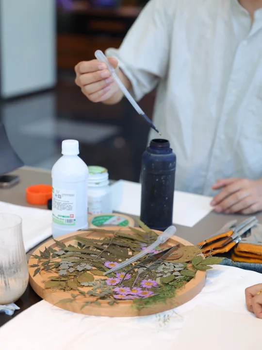 本次活动以"植物标本"为创作主题,活动现场准备了丰富的创作素材,特别精选了西安本地特色的毛茛科、兰科、蕨类等植物叶片作为创作素材。参展艺术家周鑫介绍:"蓝晒法是最能展现植物形态之美的传统工艺之一,叶片独特的脉络纹理在感光纸上会呈现出令人惊叹的细节。"