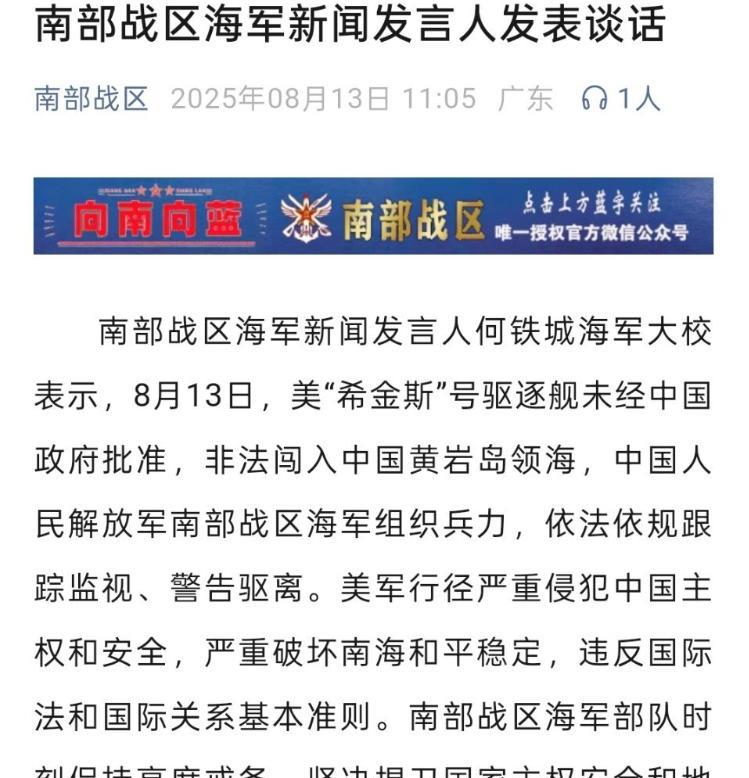 漂亮国又来捣乱了,美“希金斯”号驱逐舰非法闯入黄岩岛领海,我国南部战区马上进行了回应,坚决谴责美国的非法行为。