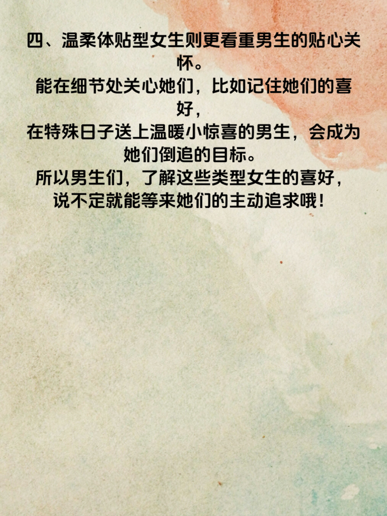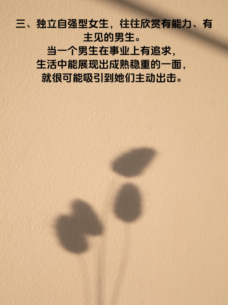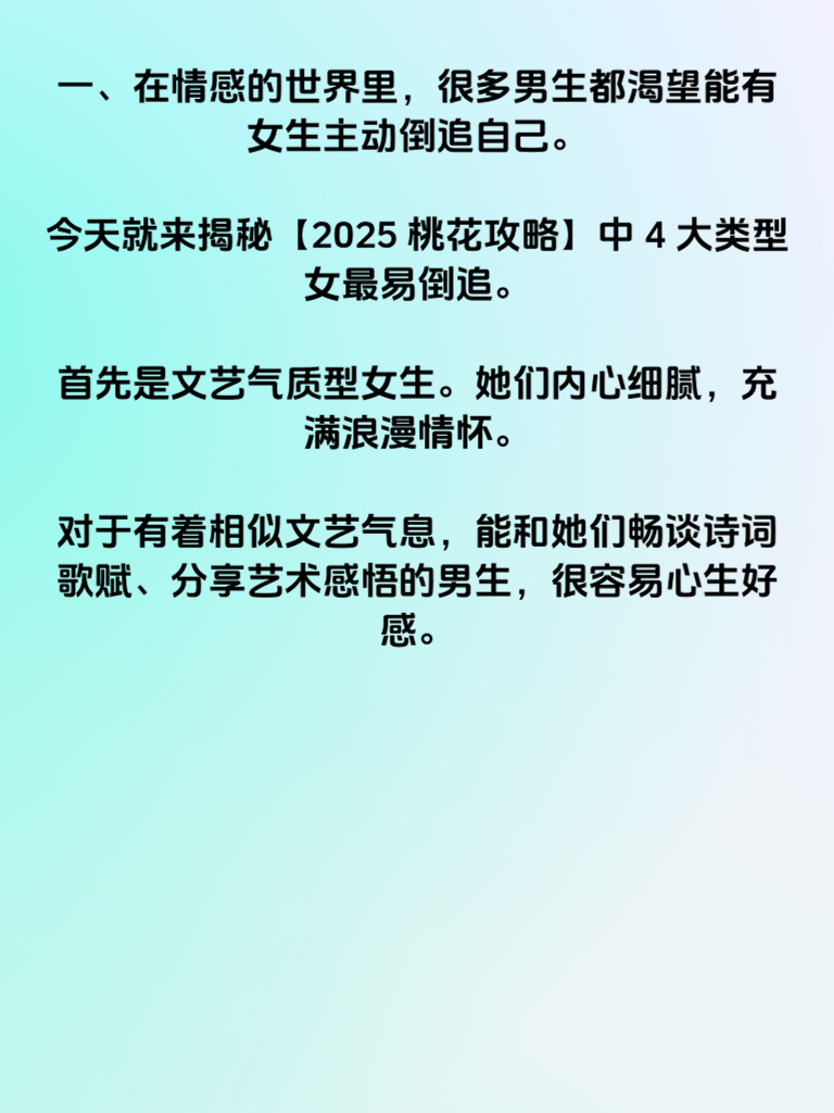 一、在情感的世界里,很多男生都渴望能有女生主动倒追自己。今天就来揭秘【2025桃花攻略】中4大类型女最易倒追。首先是文艺气质型女生。她们内心细腻,充满浪漫情怀。对于有着相似文艺气息,能和她们畅谈诗词歌赋、分享艺术感悟的男生,很容易心生好感。 二、乐观开朗型女生也不例外。她们喜欢积极向上、能给她们带来无尽欢乐的氛围。一个幽默风趣,总是能逗她开怀大笑的男生,会走进她们的心里,让她们有倒追的冲动。 三、独立自强型女生,往往欣赏有能力、有主见的男生。当一个男生在事业上有追求,生活中能展现出成熟稳重的一面,就很可能吸引到她们主动出击。 四、温柔体贴型女生则更看重男生的贴心关怀。能在细节处关心她们,比如记住她们的喜好,在特殊日子送上温暖小惊喜的男生,会成为她们倒追的目标。所以男生们,了解这些类型女生的喜好,说不定就能等来她们的主动追求哦!