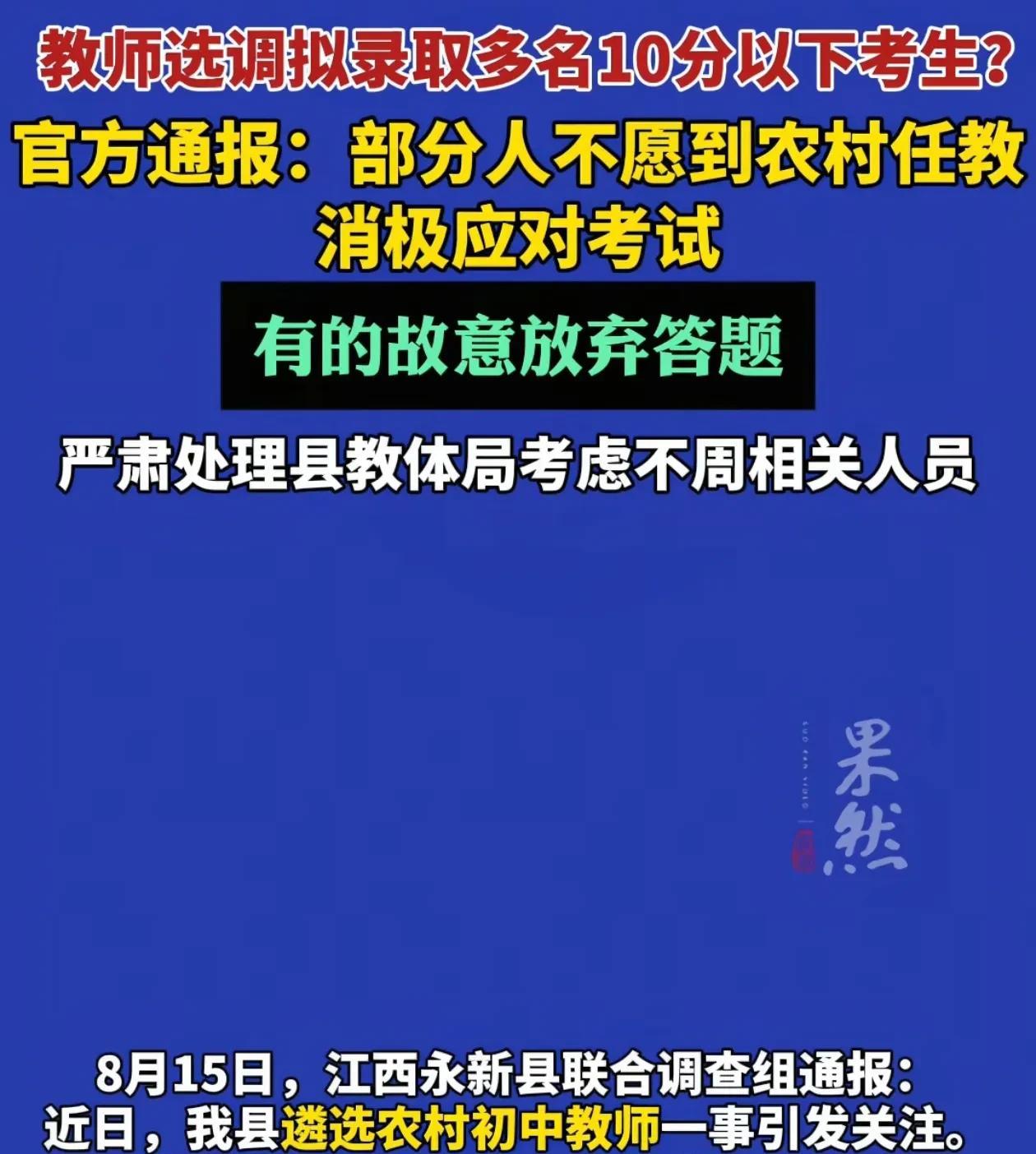 这下就能解释得过去了!近日,江西教师选调录取名单被人指出,录取多名低分教师,最初当地回应说分数低不代表教学水平低,虽然个别教师不知为何只考了几分,但他们都是具有教师资格证的,是能胜任教学任务的。 但这个回应并没有打消疑虑,反而有不少网友认为不公平,考1分都能被录取! 8月15日,官方再对此事作了通报,原来这次考试是为了解决初中教师人员不足的情况,但因为选拔方案不合理,强制教师都参加选拔考试,导致某些老师消极答题,不认真对待造成的! 这样就符合逻辑了,其实就是城市老师为了不调去农村故意考低分,而不是网友们最喜闻乐见的萝卜岗! 不过也能理解他们为啥不愿意去,一是初中有晚自习,教学压力比小学大,二是可能以后上下班离家就远了,有可能只能每周才回家,所以考低分避免被选上也是人之常情!