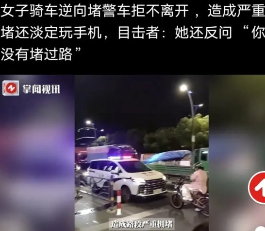 女子骑车逆向堵警车拒不离开,造成严重拥堵还淡定玩手机,有目击者劝阻,被女子反问: