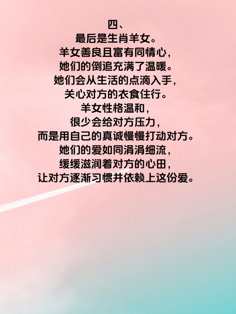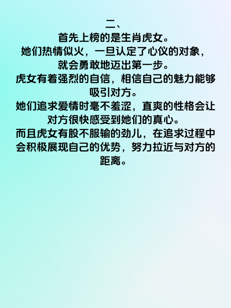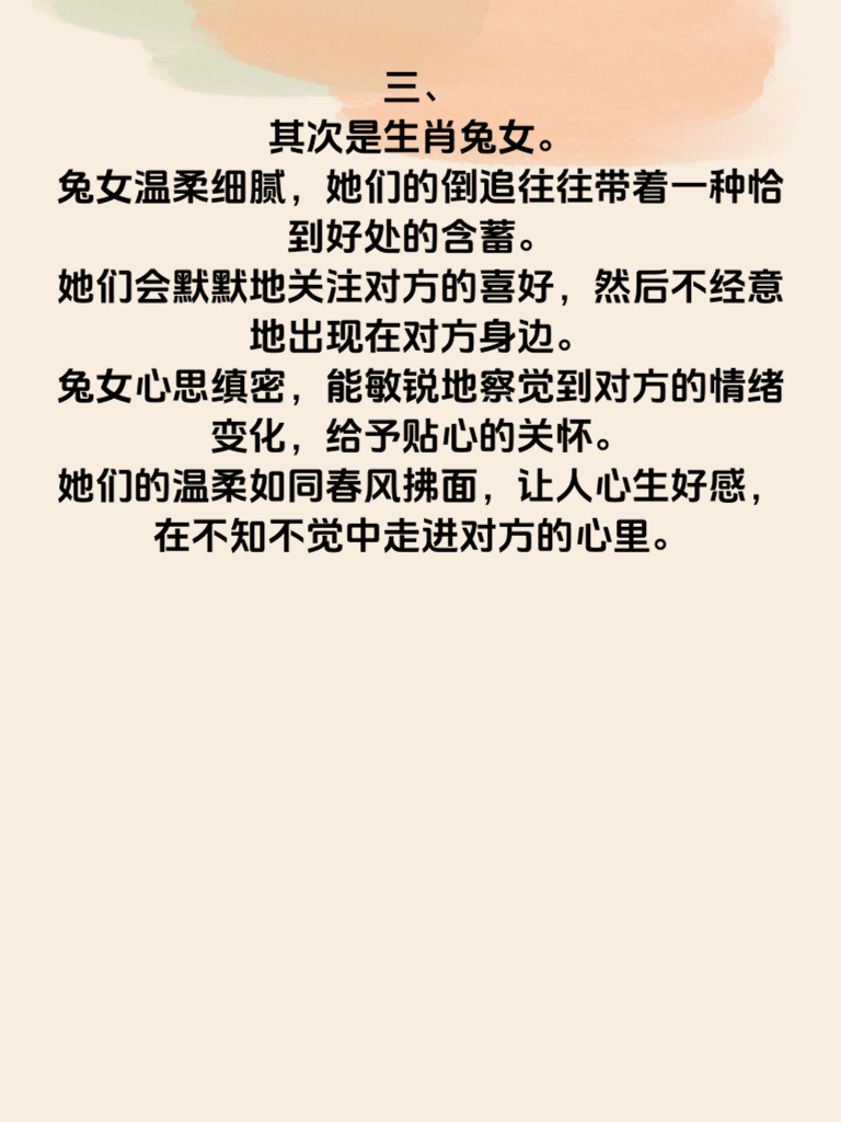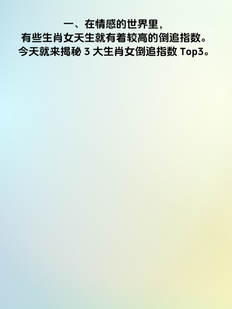 一、在情感的世界里,有些生肖女天生就有着较高的倒追指数。今天就来揭秘3大生肖女倒追指数Top3。 二、首先上榜的是生肖虎女。她们热情似火,一旦认定了心仪的对象,就会勇敢地迈出第一步。虎女有着强烈的自信,相信自己的魅力能够吸引对方。她们追求爱情时毫不羞涩,直爽的性格会让对方很快感受到她们的真心。而且虎女有股不服输的劲儿,在追求过程中会积极展现自己的优势,努力拉近与对方的距离。 三、其次是生肖兔女。兔女温柔细腻,她们的倒追往往带着一种恰到好处的含蓄。她们会默默地关注对方的喜好,然后不经意地出现在对方身边。兔女心思缜密,能敏锐地察觉到对方的情绪变化,给予贴心的关怀。她们的温柔如同春风拂面,让人心生好感,在不知不觉中走进对方的心里。 四、最后是生肖羊女。羊女善良且富有同情心,她们的倒追充满了温暖。她们会从生活的点滴入手,关心对方的衣食住行。羊女性格温和,很少会给对方压力,而是用自己的真诚慢慢打动对方。她们的爱如同涓涓细流,缓缓滋润着对方的心田,让对方逐渐习惯并依赖上这份爱。