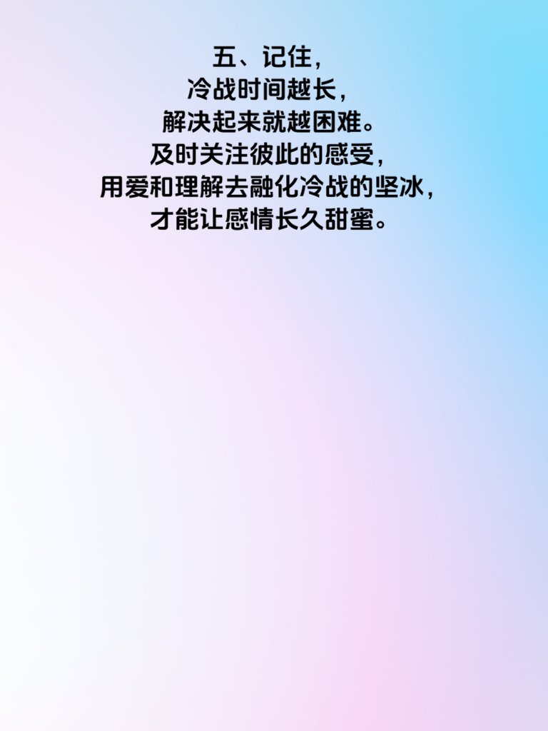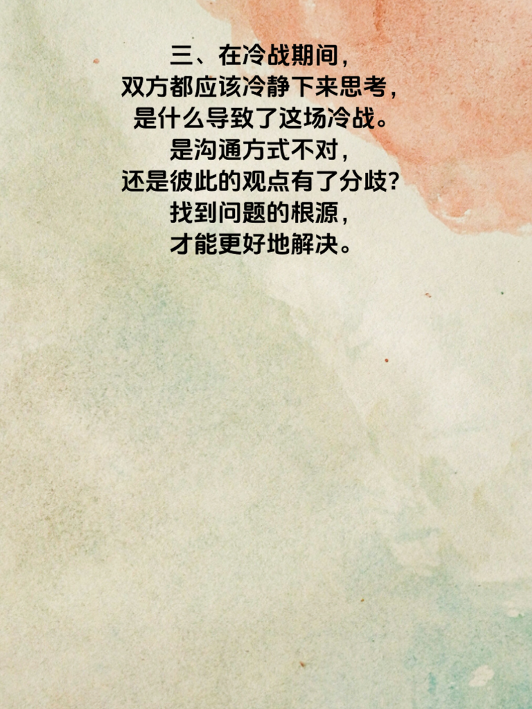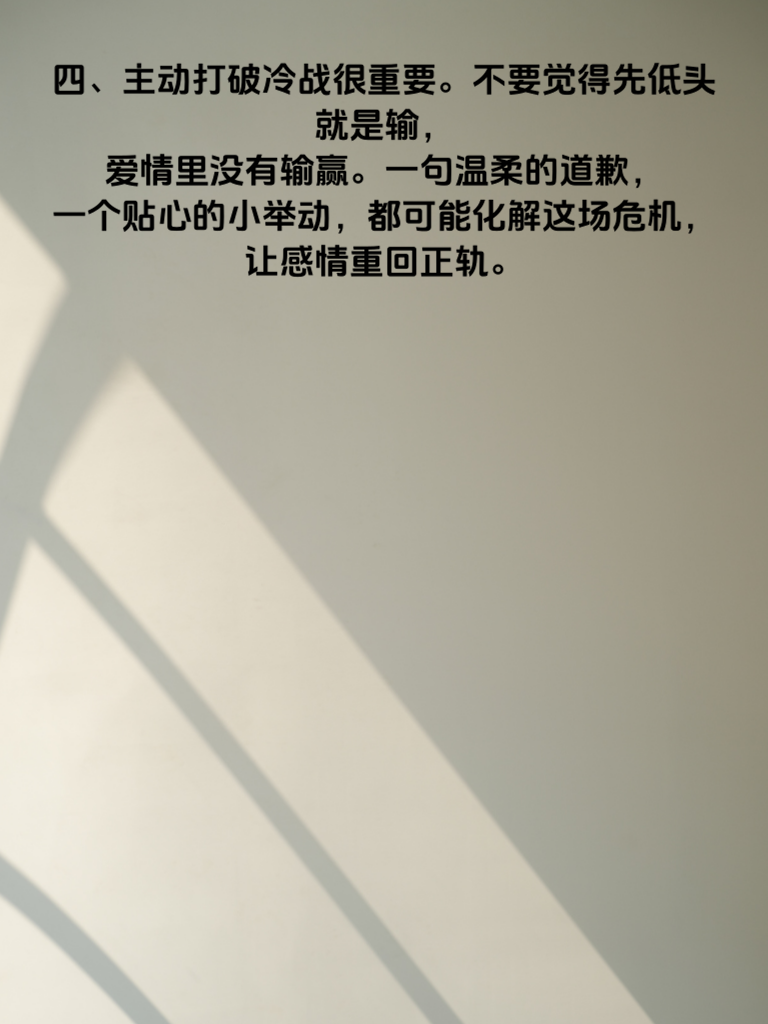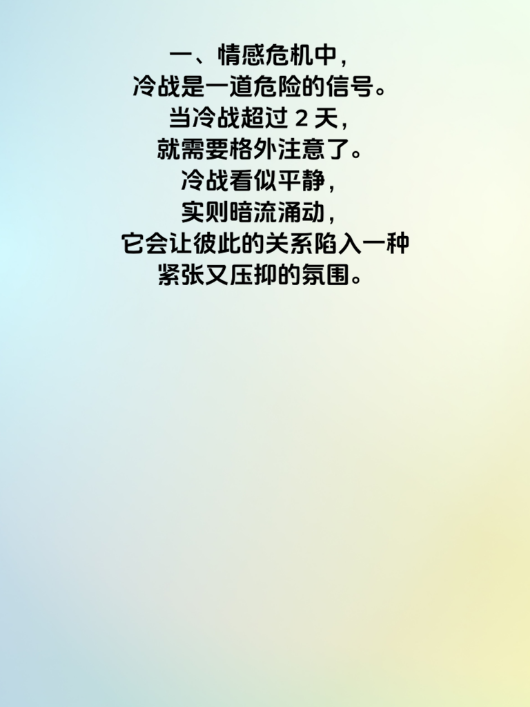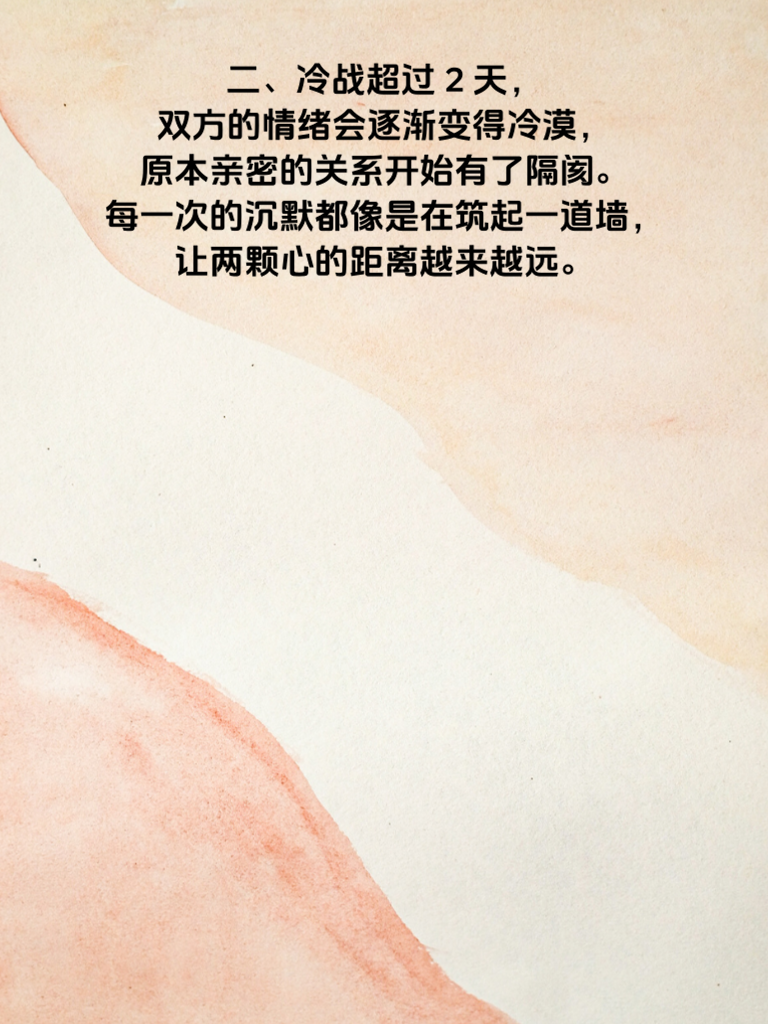 一、情感危机中,冷战是一道危险的信号。当冷战超过2天,就需要格外注意了。冷战看似平静,实则暗流涌动,它会让彼此的关系陷入一种紧张又压抑的氛围。 二、冷战超过2天,双方的情绪会逐渐变得冷漠,原本亲密的关系开始有了隔阂。每一次的沉默都像是在筑起一道墙,让两颗心的距离越来越远。 三、在冷战期间,双方都应该冷静下来思考,是什么导致了这场冷战。是沟通方式不对,还是彼此的观点有了分歧?找到问题的根源,才能更好地解决。 四、主动打破冷战很重要。不要觉得先低头就是输,爱情里没有输赢。一句温柔的道歉,一个贴心的小举动,都可能化解这场危机,让感情重回正轨。 五、记住,冷战时间越长,解决起来就越困难。及时关注彼此的感受,用爱和理解去融化冷战的坚冰,才能让感情长久甜蜜。