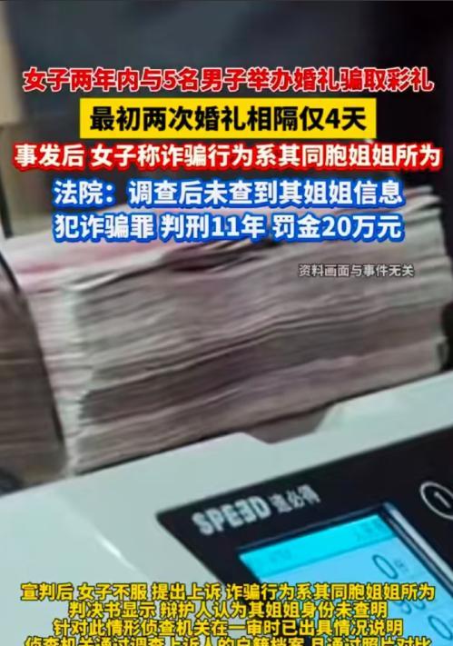安徽,女子两年之内嫁了五个男人,前四个都没领证,且每个都收超过20万彩礼,其中两场婚礼只相隔4天。可每次举办完婚礼女子都找借口离开,并退回一部分彩礼。第五次女子领了证后故技重施,丈夫直接将她起诉了,结果意外得知女子是惯犯,女子东窗事发,不仅没讨到好,反而付出了沉重的代价! “我凭本事赚钱,凭什么给我判刑!”一女子在法庭上不甘心的怒吼着。 根据8月15日的报道,2018 年年初,28岁的苏某(化名)通过媒人徐某(化名)等人介绍进行相亲,实施诈骗。 第一个相亲对象,是经媒人牵线的小伙子。两人见面没几回,苏某就顺着男方家的心意,热热闹闹办了婚礼。男方家满心欢喜,觉得儿子成家了,见面礼、订亲礼、彩礼,一样样给得大方,就盼着小两口好好过日子。 可婚礼办完没几个月,苏某找了个“回门”的由头,拖着箱子就走,之后再找理由,要么说家里有事,要么说跟男方处不来,渐渐断了联系。 尝到甜头的苏某,胆子越来越大。接下来的两年里,她用同样的套路,前前后后和 5 个男子办了婚礼。这 5 个人里,苏某就只跟其中一个领了结婚证,剩下的,全是办了婚礼收了钱,就找机会开溜。 更让人瞠目结舌的是,有两次婚礼,间隔才短短 1 周,男方家还沉浸在办喜事的喜悦里,苏某心里却早想着怎么收场、怎么找下家。 这些被苏某相中的男方,大多是普通家庭,拿出的彩礼,是父母攒了大半辈子的积蓄。有的家庭为了凑彩礼,还借了外债。他们想着,把媳妇娶进门,日子就能越过越好,谁能想到,这是一场骗局。 直到第五次,苏某和一个男子领了证,又故技重施,找理由躲着不见。这一回,男方不干了,直接把苏某告上了法庭。警察一查,才发现苏某居然是惯犯,前面已经骗了四次。 事情败露后,法院审理查明,2018 年 2 月到 2019 年 10 月,苏某通过办婚礼,骗取的见面礼、订亲礼、彩礼,加起来超过百万元。 案件一审时,法院认定苏某是以非法占有为目的,虚构事实、隐瞒真相,骗别人的财物,数额特别巨大,构成诈骗罪。考虑到苏某后来退了一部分钱,从轻判了她 11 年有期徒刑,还罚了 20 万,让她给被害人赔损失。苏某不服,声称这件事情是她姐姐所为,上诉到蚌埠市中级人民法院,结果二审调查到这件事情与苏某的姐姐无关,维持原判。 这事在网上传开后,网友们炸开了锅。 有人说:“这些男方家太可怜了,攒钱给彩礼,结果遇到骗子,日子都没法过了!” 还有人提醒:“办婚礼前,一定得把人看透,别光看表面热闹,得查查对方到底啥情况。” 通过这件事情希望大家明白,婚姻不是儿戏,更不是骗人的手段。无论是相亲还是恋爱,真诚才是基础。对于准备成家的人来说,多留个心眼,多了解了解对方的为人、背景之后再商量人生大事。 对于这件事情,你们怎么看?
