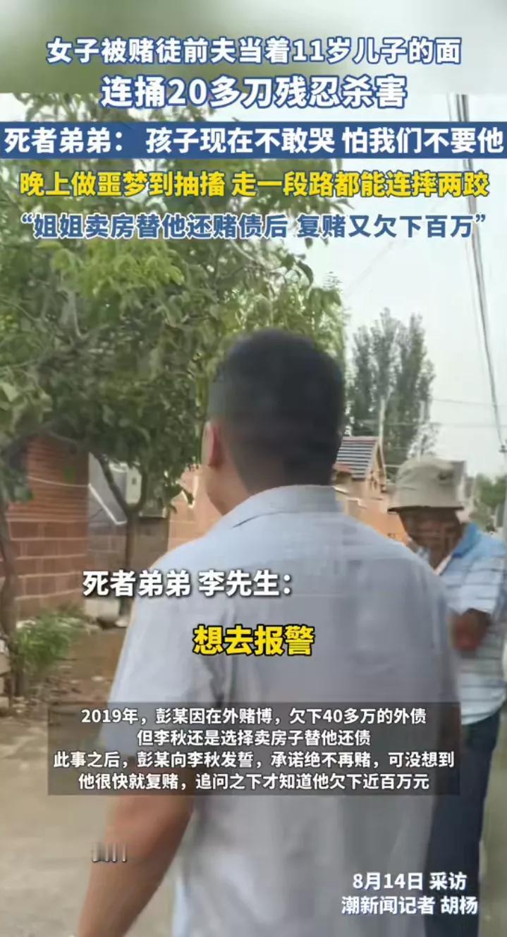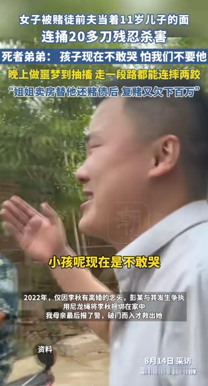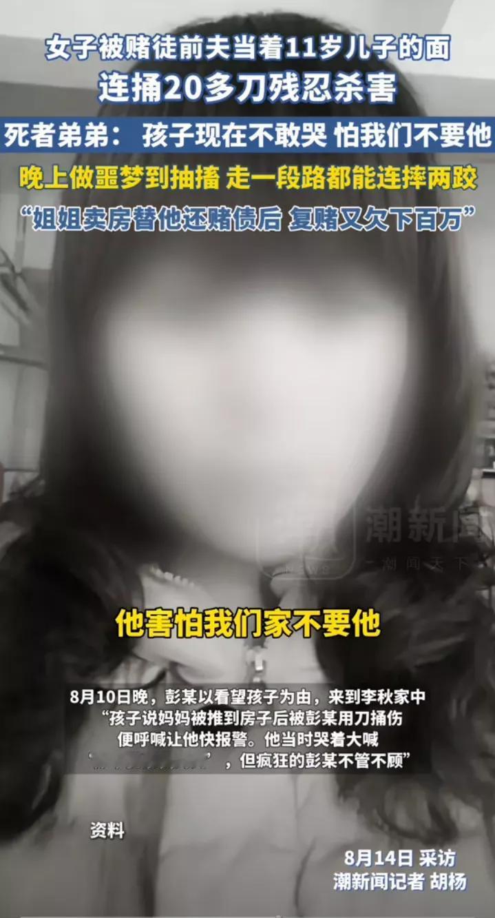 11岁男孩小浩目睹,爸爸将妈妈推进卧室,妈妈被爸爸持刀捅伤,他想报警,手机被爸爸拿走了,他无助地向爸爸哀求:“你不要杀我妈妈。” 然而,彭某装聋作哑,没有在意对儿子的话,他持刀连续捅前妻李秋20多刀。 一个小时后,彭某确认李秋死亡,他转身走出卧室,打电话报警自首。 山东临沂,李秋是一名幼师,她和彭某相亲,相识相恋而结婚,婚后,她生育一个儿子小浩。 2019年,彭某在外赌博,欠40多万赌债,他四处借钱未果,被债主天天催债。 彭某不知所措,他愁眉苦脸回家,请求李秋帮他还赌债,发誓永远不再赌博。 李秋得知此事,急得泪水夺眶而出,一番深思,犹豫再三,决定卖了自己的房子,帮彭某还40多万赌债。 2022年,李秋偶然发现,彭某欠百万赌债,她对自己的婚姻感到绝望,不禁陷入沉思。 此前,李秋帮彭某还清40多万赌债。彭某屡教不改,继续赌博欠下许多赌债。他回家求李秋用信用卡借贷,继续帮彭某还赌债。 彭某不戒赌,赌债永远还不清,一直为了还赌债借贷,看不到生活的希望。 随后,李秋主动向彭某提出离婚,彭某恼羞成怒,用尼龙绳把李秋捆绑在家里,不许李秋离开。 那天,李秋的妈妈多次拨打李秋电话,无法接通,她担心女儿的安危,拨打报警电话。 民警迅速赶到彭某家,将李秋救出来。此后,李秋和彭某离婚,一个人打两份工,抚养儿子小浩。 2025年4月,34岁李秋和中年男子洛尘相亲,两人一见钟情。7月15日,李秋和洛尘订婚, 彭某得知李秋订婚,即将举行婚礼,走向幸福生活,他醋意大发,持续发微信辱骂李秋。 8月10日,彭某以看看儿子小浩为由,进入李秋家,他将李秋推进卧室残忍杀害。 此事件中,彭某欠下40多万赌债,李秋卖房帮彭某还债,给了彭某改过机会。 可是,彭某没有体谅李秋的苦衷,继续赌博,李秋再次原谅他,用信用卡借钱,帮彭某还债,自己过了三年苦日子。 李秋对前夫已经仁至义至,却没有换来彭某一丝情意。 李秋和彭某离婚三年,她和洛尘再婚前,被前夫彭某残忍杀害。 十赌九输,不能原谅烂赌的男人,不能为他还赌债,不能给他无数次改过机会,及时远离他,才能保护好自己,和自己的财产。 文中人物均为化名。来源潮新闻。