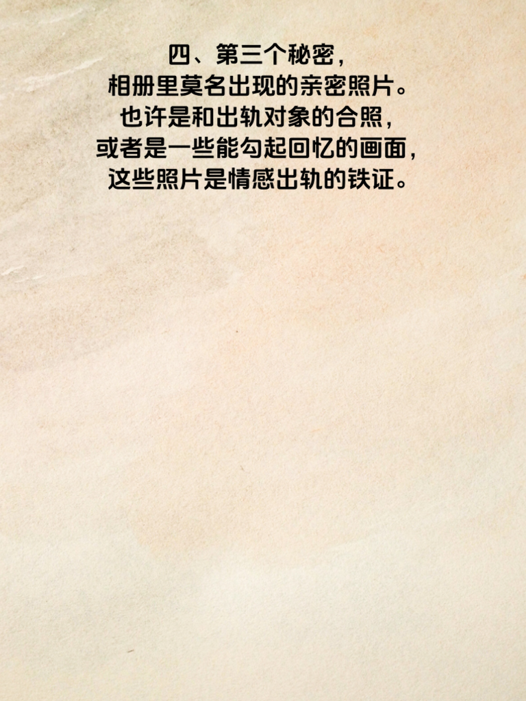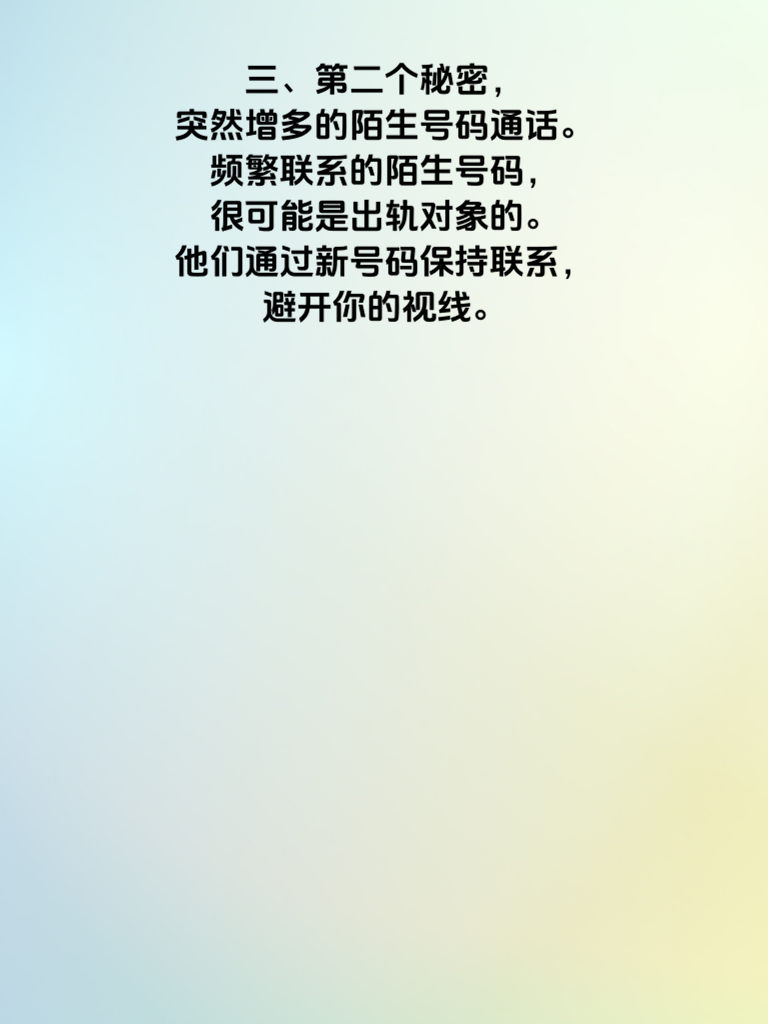 一、婚内出轨,是婚姻中最伤人的利刃。伴侣手机里藏着的秘密,往往是情感破裂的信号。想知道那些可能暗藏危机的秘密吗? 二、第一个秘密,频繁加密的聊天记录。这背后或许藏着不想让你知道的暧昧对话。加密意味着有不想被你看到的内容,可能是与他人的亲密交流。 三、第二个秘密,突然增多的陌生号码通话。频繁联系的陌生号码,很可能是出轨对象的。他们通过新号码保持联系,避开你的视线。 四、第三个秘密,相册里莫名出现的亲密照片。也许是和出轨对象的合照,或者是一些能勾起回忆的画面,这些照片是情感出轨的铁证。 五、第四个秘密,行程记录里频繁出现的神秘地点。经常去一些不告诉你的地方,很可能是和出轨对象幽会的地点。 六、第五个秘密,消费记录里不明不白的支出。可能是为出轨对象买礼物或者一起消费的支出。当你发现这些秘密,婚姻或许已千疮百孔。及时沟通,努力修复,若无法挽回,也要勇敢面对,重新寻找生活的方向。