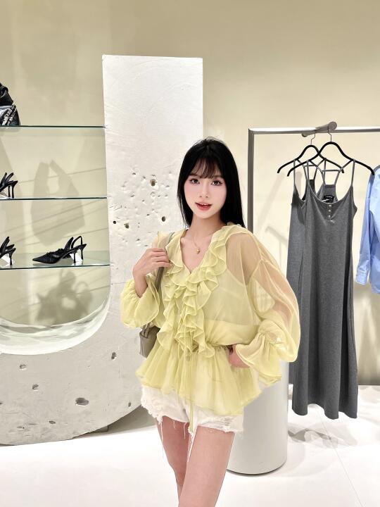 浅绿色荷叶边上衣搭配白色短裤