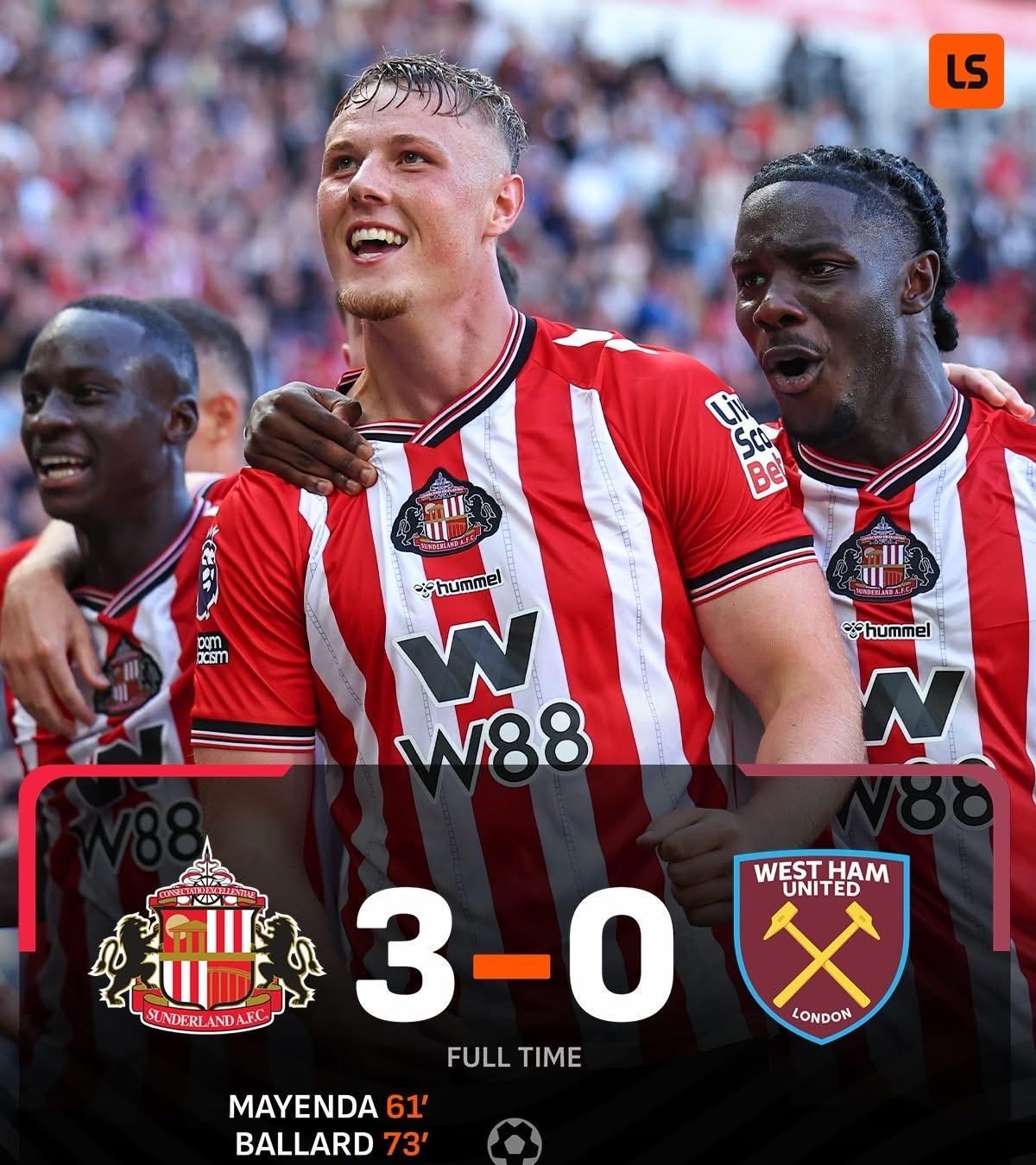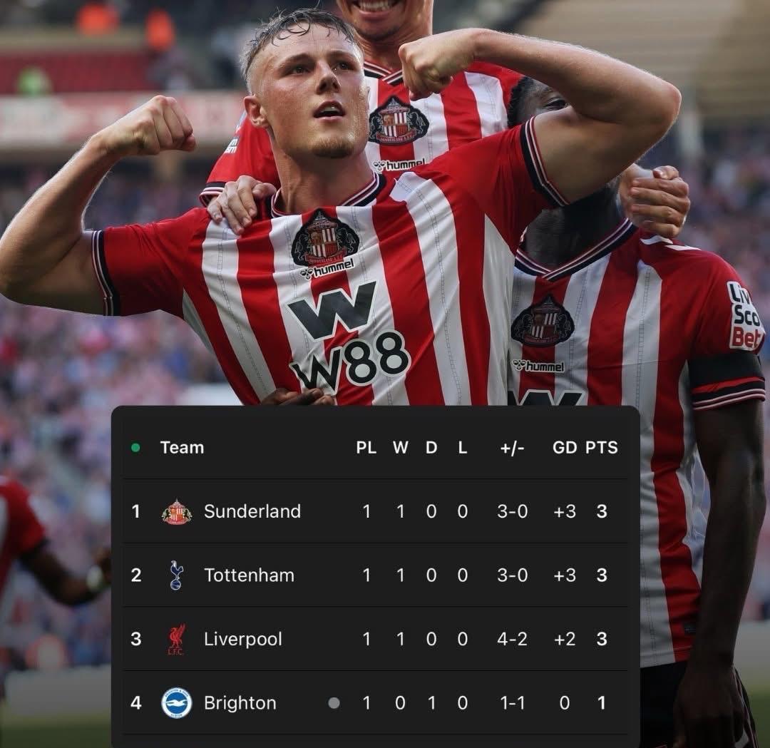 升班马桑德兰3比0大胜西汉姆,时隔足足八年,桑德兰终于重返英超舞台,而首战就取得了胜利! 如果你有关注桑德兰今夏的引援,其实不会对这个结果感到意外,桑德兰甚至挖角了勒沃库森的队长扎卡,这位前阿森纳队长,可说是身经百战。 桑德兰和热刺均3比0赢下对手,因此俩队的净胜球一样,本该是并列榜首的。 不过,桑德兰的第一个字母是S,热刺的第一个字母是T,因此桑德兰暂列榜首! ! ! 八年归来!黑猫苏醒丨三大核心+法式战术!新季黑马或是桑德兰?