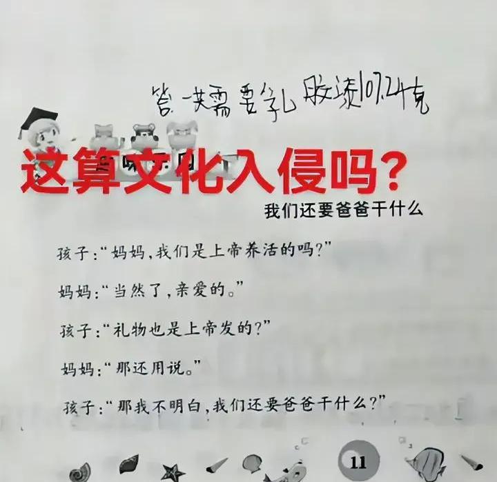 暑假作业也被文化入侵,简直防不胜防。 近期网友分享了自家孩子的暑假作业里面有一篇文章,叫“我们还要爸爸干什么”? 内容相当离谱: 孩子:“妈妈,我们是上帝养活的吗”? 妈妈:“当然了,亲爱的”。 孩子:“礼物也是上帝发的”? 妈妈:“那还用说”? 孩子:“那我不明白,我们还要爸爸干什么”? 我们也不明白,这么离谱的文章是怎么过审的?短短几行字,把上帝说成是造物主,把爸爸说的一无是处,按照这个逻辑,要爸爸可不就是没用了。 先不说各位爸爸心里作何感想,就说这篇文章,算不算文化入侵?