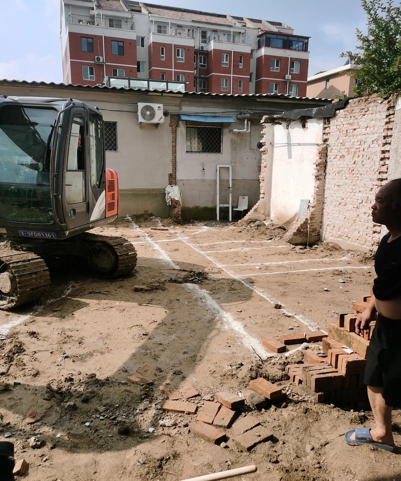 起槽,早上8点开始按计划图纸进行挖槽,先用白灰画出量好的内墙及外墙尺寸中线,大约80公分宽,深70公分。勾机把土放到两旁及中间空地,准备垒好基础后回填土。[给力][给力][给力][给力][赞][赞]又把外场平整一遍,准备好场地。明天早上进砂,石,砖。先进12000块砖,2吨灰,五方沙子。[点亮平安灯][点亮平安灯][赞]而后在基槽内加钢筋水泥一遍。稍凝固后在做50墙基础两层,再向上垒做37墙基三层,而后再做24墙出地平。再回填土石,压紧在松土把院子找平,再改正房下水,上水和电,铺地暖。这工作做好后,再铺贴地瓷砖和墙瓷砖。[送自己一朵花][送自己一朵花][送自己一朵花][给力][给力][给力]工程量还多呢!
