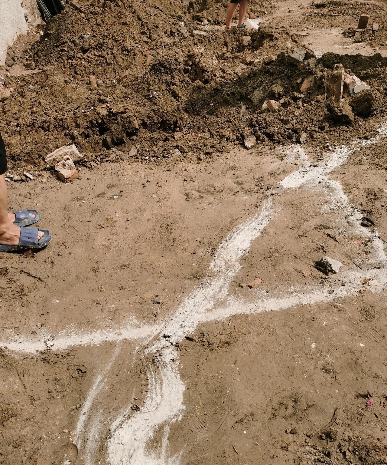 起槽,早上8点开始按计划图纸进行挖槽,先用白灰画出量好的内墙及外墙尺寸中线,大约