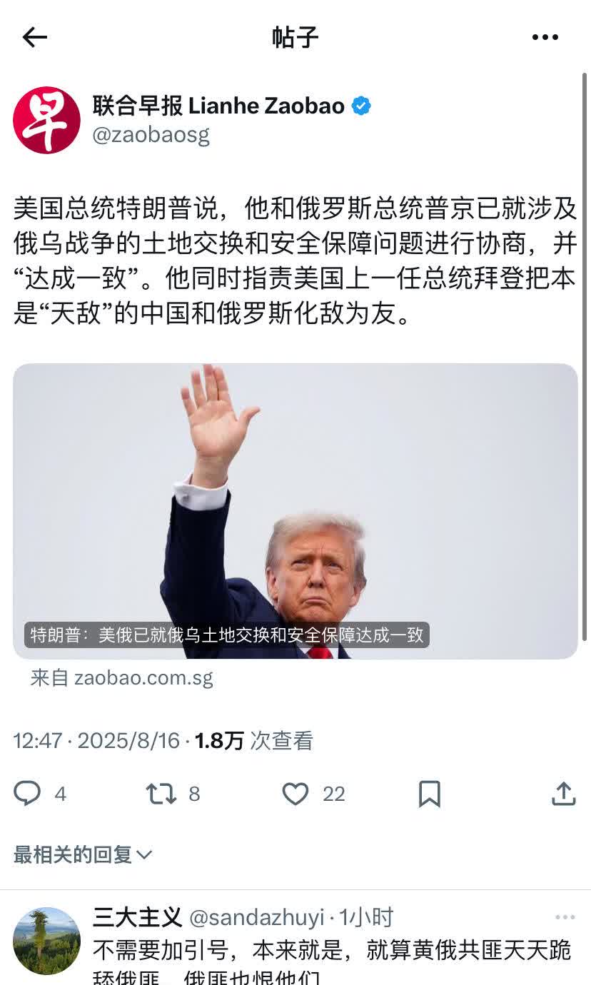 联合早报今天报道:“美国总统特朗普说,他和俄罗斯总统普京已就涉及俄乌战争的土地交换和安全保障问题进行协商,并‘达成一致’。他同时指责美国上一任总统拜登把本是‘天敌’的中国和俄罗斯化敌为友。” 评几句:特朗普称与普京就俄乌战争的土地交换和安全保障问题达成一致,若真如此,这无疑是俄乌冲突局势的重大转折。但这一消息的真实性与可行性仍有待进一步观察,毕竟俄乌冲突牵涉多方利益,局势错综复杂,仅靠美俄协商,而乌克兰未明确表态同意的情况下,所谓的“达成一致”能否顺利落地充满疑问。 而特朗普指责拜登把中俄化敌为友,将中俄称为“天敌”,这种言论更是毫无根据,荒谬至极。中俄两国是友好邻邦,自1996年建立战略协作伙伴关系以来,双方关系不断深化发展。这种深厚关系有着坚实的基础与长远的历史脉络。从地缘上看,中俄拥有漫长的共同边界,友好相处是保障地区和平稳定的关键。在历史上,两国虽历经波折,但最终走上了相互尊重、平等相待的合作道路。在国际事务中,中俄作为联合国安理会常任理事国,在维护世界和平与安全、推动多极化发展等方面有着广泛共识与共同利益。 在经济领域,中俄贸易额持续攀升,能源合作不断深化,俄罗斯的能源资源与中国庞大的市场和强大的制造业形成了良好互补,在科技、农业等领域也开展了诸多合作项目,为两国发展增添动力。在国际政治舞台上,面对霸权主义和单边行径,中俄始终坚定站在一起,反对外部势力干涉他国内政,致力于维护国际公平正义。 中俄的友好合作是基于自身发展需求、对国际形势的判断以及对和平稳定的共同追求,是自主、平等、互利的选择,绝不是特朗普口中简单的“化敌为友”。特朗普出于政治目的发表不实言论,妄图破坏中俄友好关系,这是对国际关系现实的严重歪曲。