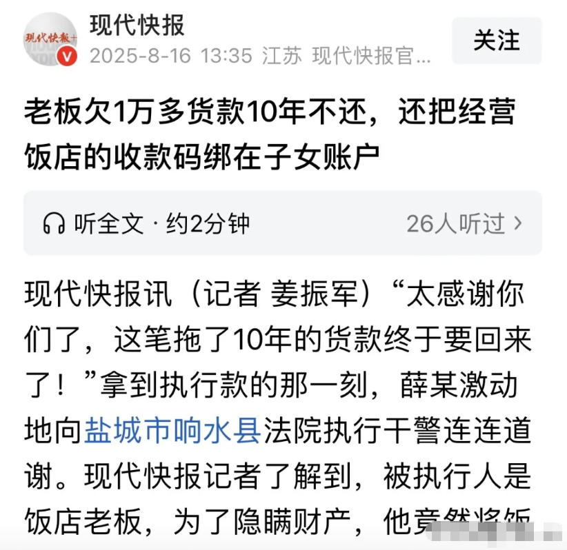 8月16号,据现代快报报道,2023年的一天,法院执行局走廊里,58岁的薛某攥着刚收到的执行款,眼眶泛红。