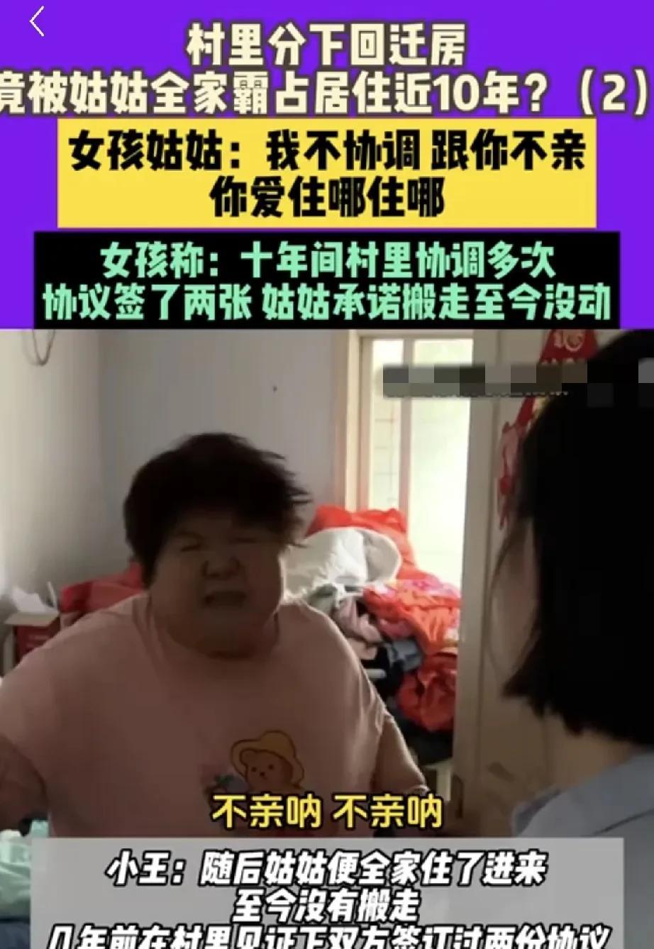 河南郑州,一女子父亲去世,母亲改嫁,她跟着爷爷奶奶长大,村里分回迁房,也给女子分了一套,姑姑以照顾奶奶为由,搬进女子房子,谁知奶奶去世,姑姑赖着不走,村里做了多次调解,女子给了姑姑2万元“孝亲费”,换取姑姑搬离承诺,谁知姑姑收钱之后,撕毁协议: 我不协调,你该死哪死哪,法院判了也不搬!村里长辈看不下去: 她想吃绝户! 2025年8月17日,据极目新闻报道,一女子无父无母,房子被姑姑霸占,扬言法院判了也不搬走! 小王命运凄苦,年幼的时候失去了父亲,母亲改嫁离开,留下她一人,孤苦伶仃。 爷爷奶奶慈爱,将她带回家中,叔叔为人忠厚,对待小王,好像亲生女儿。 小王拂去了眼泪,茁壮成长,她成为家中的一员,爷爷奶奶爱她如掌上明珠。 小王的户口也在家里,2015年,村里按照户籍人口分回迁房,小王作为家中成员,拥有一份产权,成功获得了一套房子。 谁知已经出嫁的姑姑回来,执意要住进小王的房子,她说小王还小,她住进来,可以照顾小王的奶奶。 小王没有多想,这么多年的操劳,奶奶的身体的确不好。 随着孩子们的长大,奶奶日渐衰老,她逐渐衰弱,身体一日不如一日。 小王那时年幼,只要能照顾奶奶,姑姑要住,就让她住吧,毕竟奶奶的确需要有人照顾。 谁知不久,爷爷奶奶还有叔叔相继去世,姑姑住在里面,没有丝毫搬走的意思。 姑姑把门锁一换,小王回不了家,只有在外面租房居住。 2019年,小王回去要房,她想不通,明明有自己的房子,却有家不能回,凭什么这样被姑姑欺负! 姑姑和小王签下协议,等姑姑新房装修后搬离。 谁知姑姑新房分到手后,她把自己的房子租了出去。 她一声不吭,收着租金,继续住在小王的房子。 小王知道后找了回来,和她理论: 你咋能不守信用,把你自己的房子出租牟利!你还我的房子,你快搬走! 姑姑张口就骂: 我和你不亲,你爱死哪死哪去! 小王身单力薄,争不过她,实在没法,找到村委寻找帮助。 2023年,村委做出调解,由小王和叔叔的儿子,也就是小王的堂弟,共同出20000元“孝亲费”,换得姑姑搬走的承诺。 谁知人无廉耻,无法可治,姑姑把钱一收,立刻撕毁了协议。 小王和堂弟找他理论,你作为长辈,咋能如此对待自己的侄女,可姑姑又是一顿大骂,耍起了无赖。 姑姑的女儿和她母亲一样,蛮不讲理,她一蹦三尺,让小王有本事告去。 母子俩堵住门口,姑姑扬言: 法院判了我也不搬! 时至今日,姑姑霸占小王的房子,已经10年,小王有家难归,成了一块心病。 为了这套房子,姑姑撒泼耍赖,丝毫不顾亲情,以照顾老奶奶的名义,搬进去就不出来。 小王如今有了自己的家庭,她已经怀有5个月的身孕。 从她少年时开始,一直至今日,自己的房子自己住不进去。 小王拿着协议复印件找记者求助,记者到家里采访,姑姑挡在门口,对着小王又破口大骂: 你爱去哪去哪,滚! 姑姑女儿跟在后面还是那一句: 你告去吧! 记者劝她,你是她亲姑,她是你亲侄女,你们多亲呀! 姑姑连声否认: 不亲,不亲,一点也不亲,滚! 随后,她抓起那份协议复印件撕了个稀巴烂,随手摔在地上,对着小王暴 跳大骂! 村里长辈们看不下去,对这一对母子嗤之以鼻: 小王自小没了父母,没有兄弟姊妹,没人替她做主。 她姑姑想吃绝户,住着小王的房子,自己的房子拿来出租,一根萝卜她两头切,两头的便宜她都想占! 长辈们表示,如果小王告上法院,他们愿意出庭作证,证明这套房子归小王所有。 小王下了决心,绝不会妥协,既然姑姑不顾亲情,那她就要用法律途径保护自己的权益。 那么,这件事在法律上是怎么认定的呢? 《民法典》第240条规定:所有权人对自己的不动产或者动权,依法享有占有、使用、收益和处分的权利。 小王作为户籍在册的家庭成员,获得回迁房一套,她作为产权人,依法享有对该房屋的占有、使用、收益和处分权。 小王系房屋合法所有权人,姑姑的占有行为缺乏法律依据,小王可通过物权保护请求权主张权利。 《民法典》第462条规定:占有的不动产或者动产被侵占的,占有人有权请求返还原物。 姑姑最初以照顾奶奶为由入住,但奶奶去世后,其继续占有房屋已无合法事由,转变为无权占有。 小王作为所有权人,有权行使返还原物请求权,要求姑姑搬离并返还房屋。 但需要注意的是,返还原物请求权的行使期限为自侵占发生之日起一年内。 姑姑自奶奶去世后持续占有房屋,小王在2019年、2023年多次主张权利,未超过一年行使期限,请求权未消灭。 小王可主张返还原物请求权,要求姑姑立即搬离并返还房屋。 姑姑扬言,判了也不搬,小王可申请法院强制执行。 金钱面前,亲情被姑姑摔得稀碎,她以为靠耍无赖,就没人能管,殊不知法网恢恢,小王的权益自然会有法律保护! 对此,你怎么看? 关注@王哥说法 学习法律。