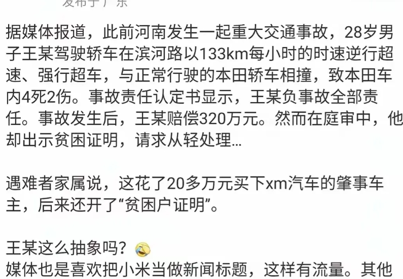 显然,这起事故颇具代表性,当中不乏一些耐人寻味之处。首先,事故发生于今年2月份,至今已经有半年时间了,可以看出当时视频是被封禁了,只剩个别图片流传,也没有任何官方通报,牛逼了啊,这里肯定要表扬某些法务,但是现在也要批评法务,没有做到有始有终,放松了警惕,以至于现在被公告天下。第二,这个贫困证明是怎么开出来的? 这个也是要追究的,贫困户能开20几万的车?难道为了信仰,举全家之力砸锅卖铁买了这车?第三,非高速路开到133的时速,这是追求一种怎么样的信仰,不知道累总看了这样的新闻还是不是只累了,憔悴了,难道不应该有点心痛去面壁思过吗?