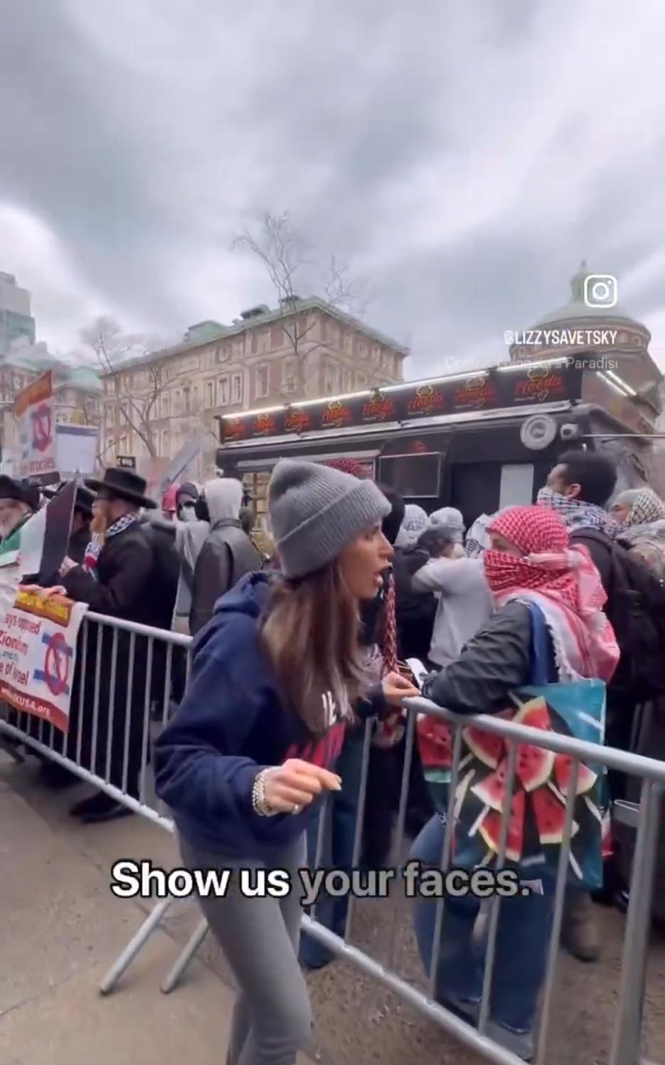 “你们如果是正义的,为什么要蒙着脸?”一个勇敢的女子,对着那些在街头叫嚣着支持哈马斯的极端分子说:“撕下你们心虚蒙面的伪装吧!你们对美国仇恨暴露无遗!那你们为什么留在这里?你们竟然支持那些冷血屠杀一位母亲和她两个孩子的哈马斯凶手。你们的立场令人不齿。以色列万岁!”