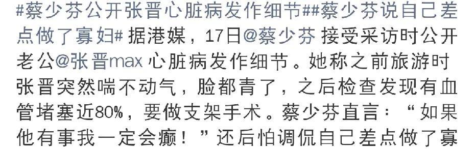 蔡少芬,后怕了! 8月17日蔡少芬在采访中提起张晋的心脏病,语气中都带着恐惧,看
