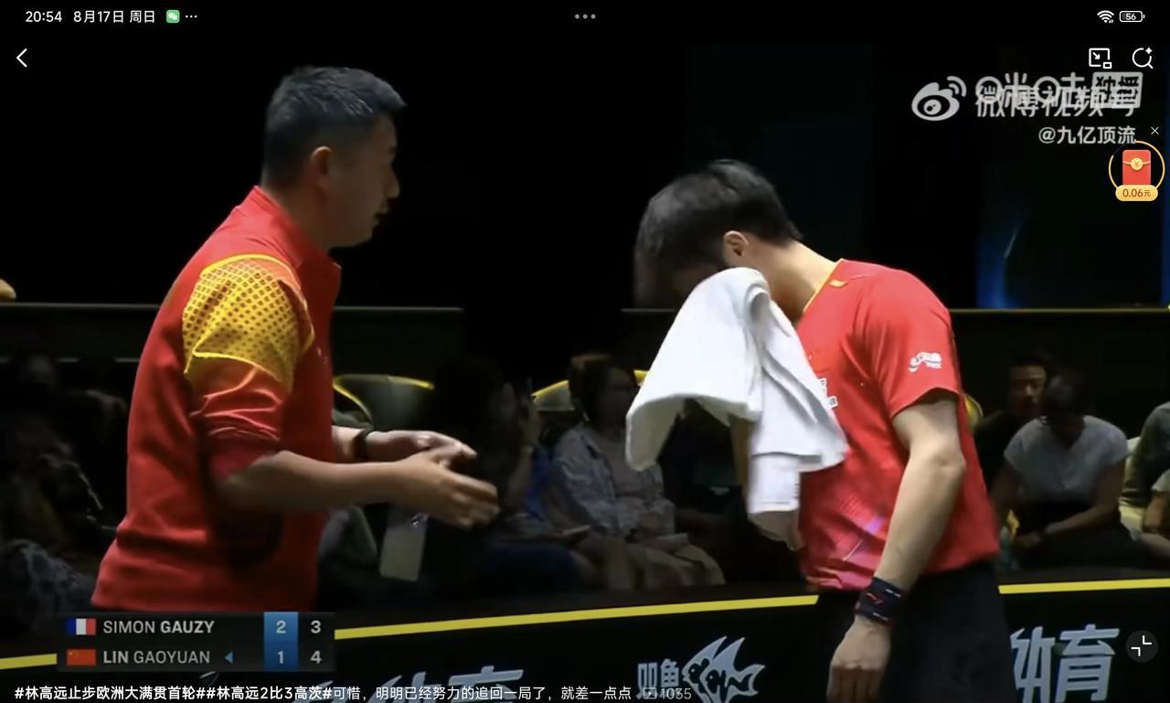 08月17日,林高远止步首轮,真是太可惜了,感觉林高远会离赛越来赛远了,不过看到场外教练是刘恒时,感觉这样的结局也不是没有可能的。赢球后的西蒙也是激动得躺在地上 林高远2:3惜败西蒙,在第二局中,更是仅得2分,自身失误增多,从领先到保守,落后打得比较急,刘恒教练在场外却没能及时的调整技战术,看着林高远的状态慢慢的下降时,国乒主力的位置也会慢慢动摇的,但愿林高远能抛开一切杂念,闭着眼睛冲,使劲的抡起来,下个赛场见! 欧洲大满贯林高远VS西蒙,高茨五局比分: 11:9,9:11,2:11,11:6,9:11