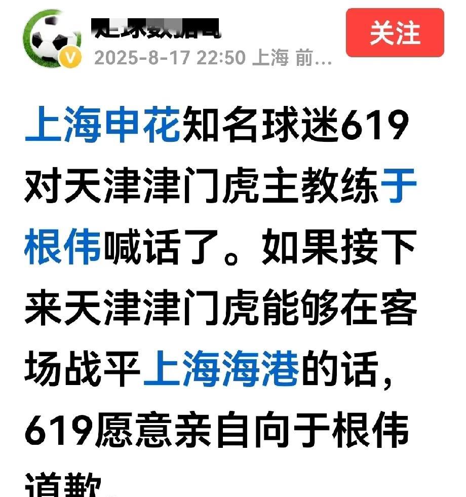 如今乞求津门虎没有用 有一个自称为知名球迷的人,居然乞求津门虎去阻击海港,还宣称要是津门虎能与海港下轮战平的话,“619愿意亲自向于根伟道歉”。 真把自己当成个人物了,又说着软话奉承“于根伟其实做得不错”。于根伟却被弄得一头雾水,根本就不认识这个人,也没必要去理会,肯定不会给予半个字的回应。 可天津当地的球迷忍不住说出了一连串的相声段子,这些段子就像带着血刃的回旋镖:“你赢不了,凭什么让我阻击”、“跟红皮必须轮换,最后一轮与蓝皮必须死磕,也只能死磕”、“就输海港,跟你玩”、“多看他一眼就是赏他脸”……字里行间,将嘲讽的语言运用得出神入化。 先前全场羞辱于根伟的时候那可是相当疯狂,没想到现在自个居然乞求于根伟,这转变来得也太突然也太快了。 乞求,只是一根稻草。 乞求:只是一场空欢喜!
