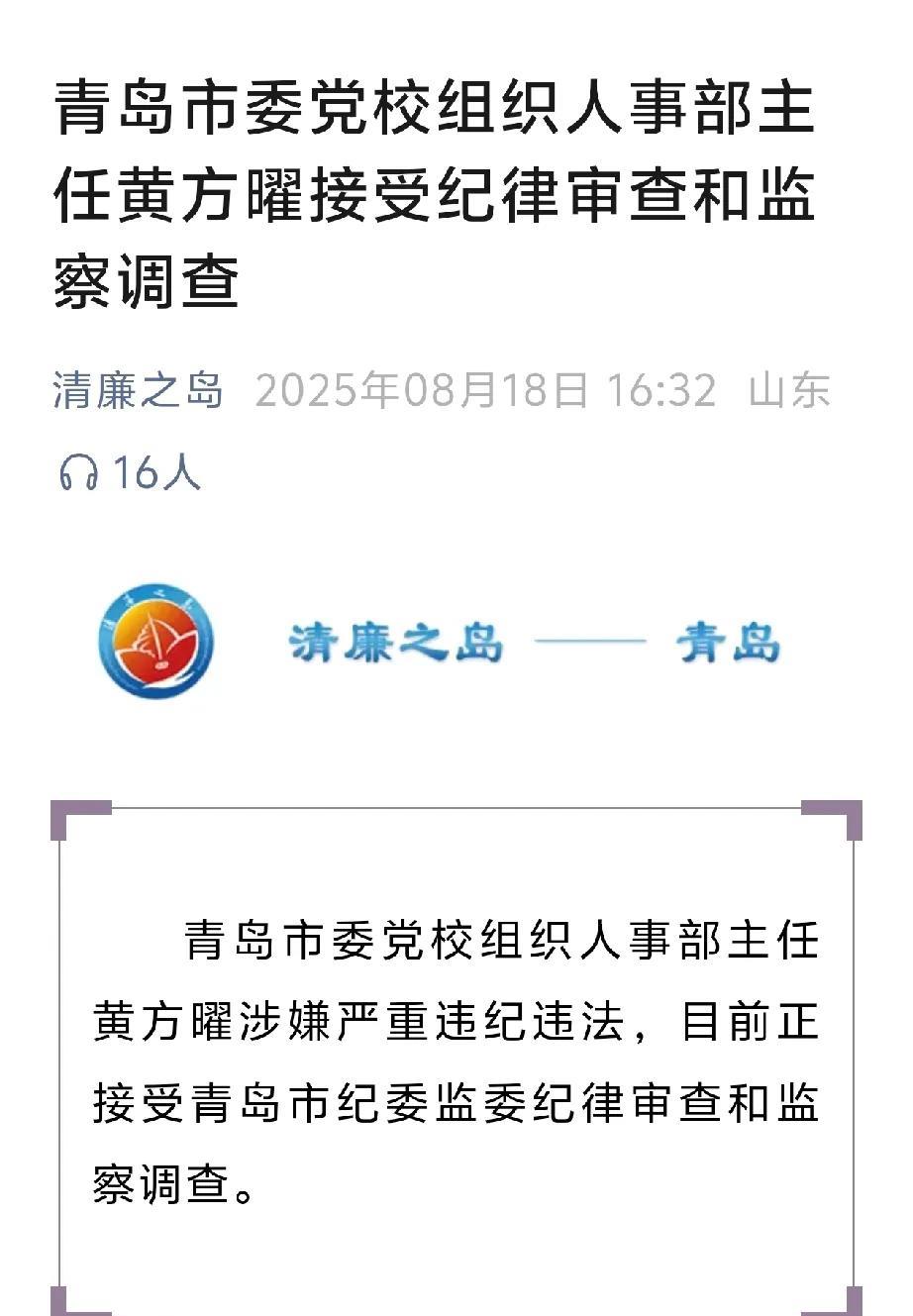 青岛市又有一领导干部被查!青岛市委党校组织人事部主任黄方曜涉嫌严重违纪违法,目前