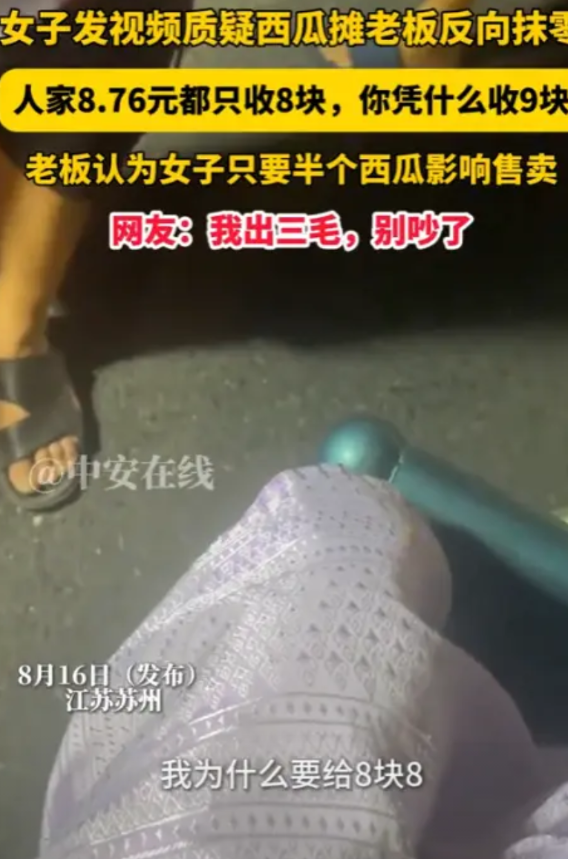 “吵翻了!”2025年8月,江苏苏州,一女子在路边一西瓜摊买西瓜,花了8块7毛6,结果,老板反向抹零,要收9块,然而,女子不愿意了,直言:人家8.76元都只收8块,你凭什么收9块!老板却认为女子只要半个西瓜影响售卖!网友:我出3毛,别吵了!