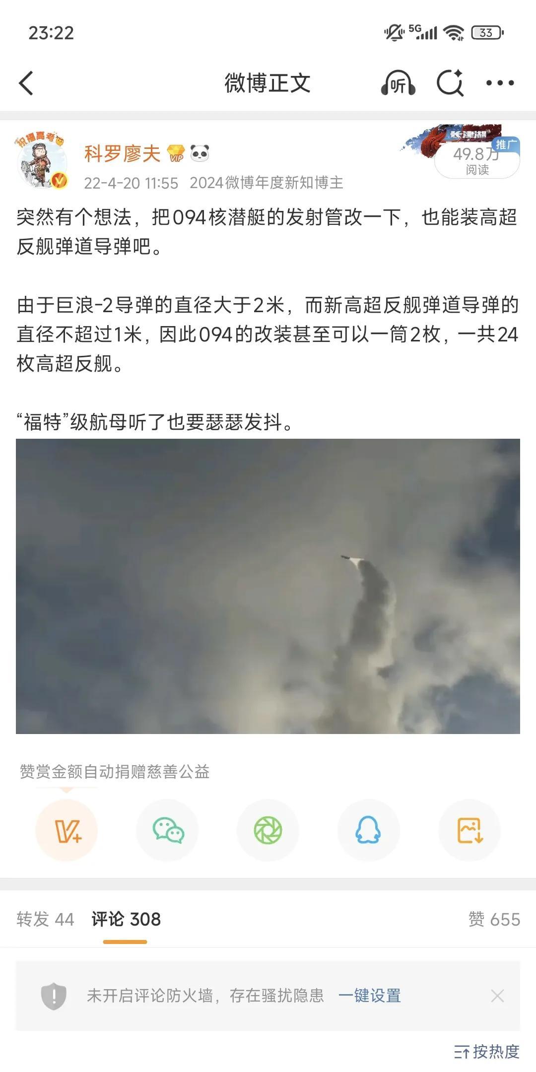 一次齐射,能歼灭美国一个航母战斗群。 有了如此之多型号的高超武器,我国的094战略核潜艇可改装为高超音速导弹发射平台,一筒三弹,携带36枚YJ系列高超导弹。福特级航母听了也要瑟瑟发抖。 2022年的时候,我曾经提过这事,把现役一两艘094战略核潜艇改装一下,每个战略导弹发射筒可以容纳三枚高超音速导弹,全艇携带36枚高超导弹,包括YJ-17,YJ-19和YJ-20。 看论文显示,我军在这方面是有一定研究的。如果按照2.21米的发射筒尺寸,094核潜艇的12个潜射发射筒完全可以装得下36个高超音速导弹,甚至可以配备对陆攻击高超音速巡航导弹武器系统,能够迅速增加对陆对海的打击火力,具有相当高的性价比优势。