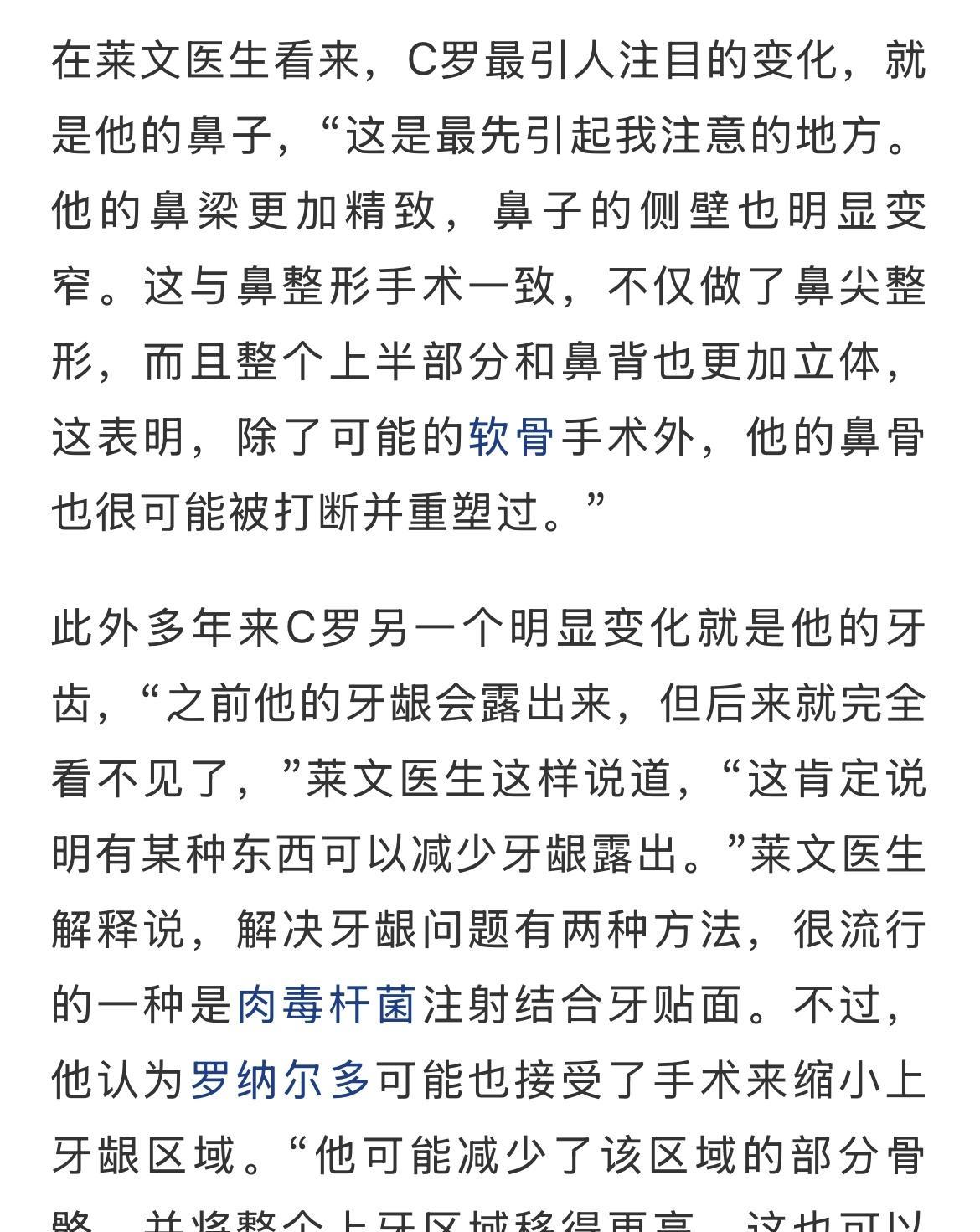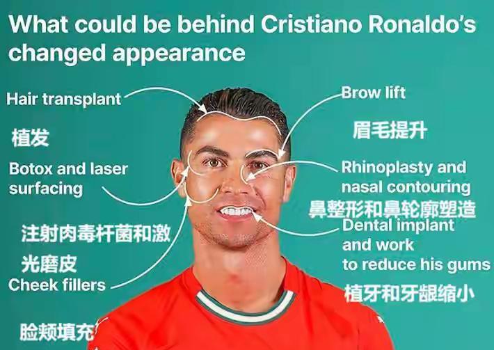 C罗被曝多次整形,包括鼻子和牙齿的调整,以及面部注射等。最引人注目的变化就是他的