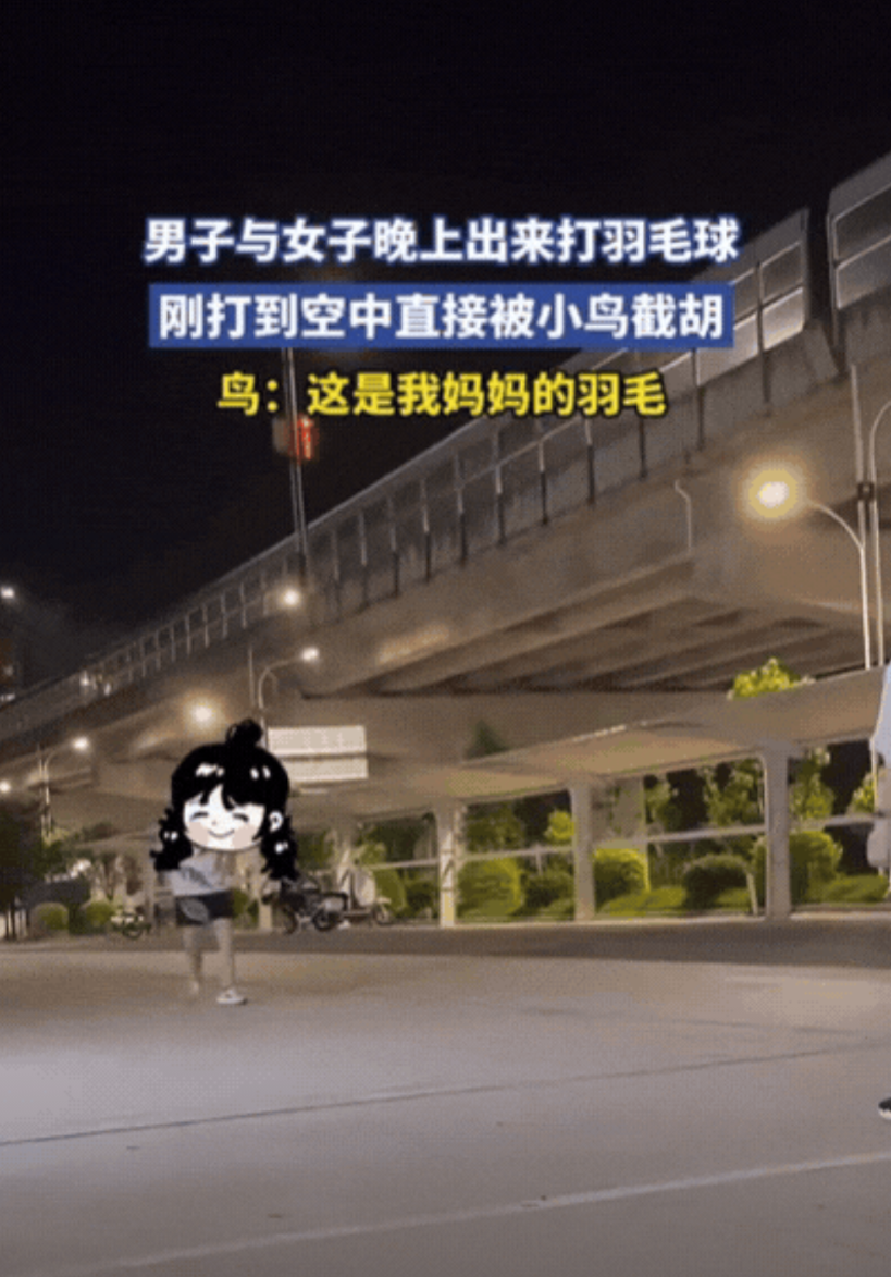 录像的朋友更是笑得直不起腰,拿着手机追着小鸟拍,嘴里还念叨着 “活久见,打羽毛球还能被鸟截胡”。等小鸟飞没影了,他才转过身,对着呆站着的两人说:“得了,这下省得打了,回家吧。”