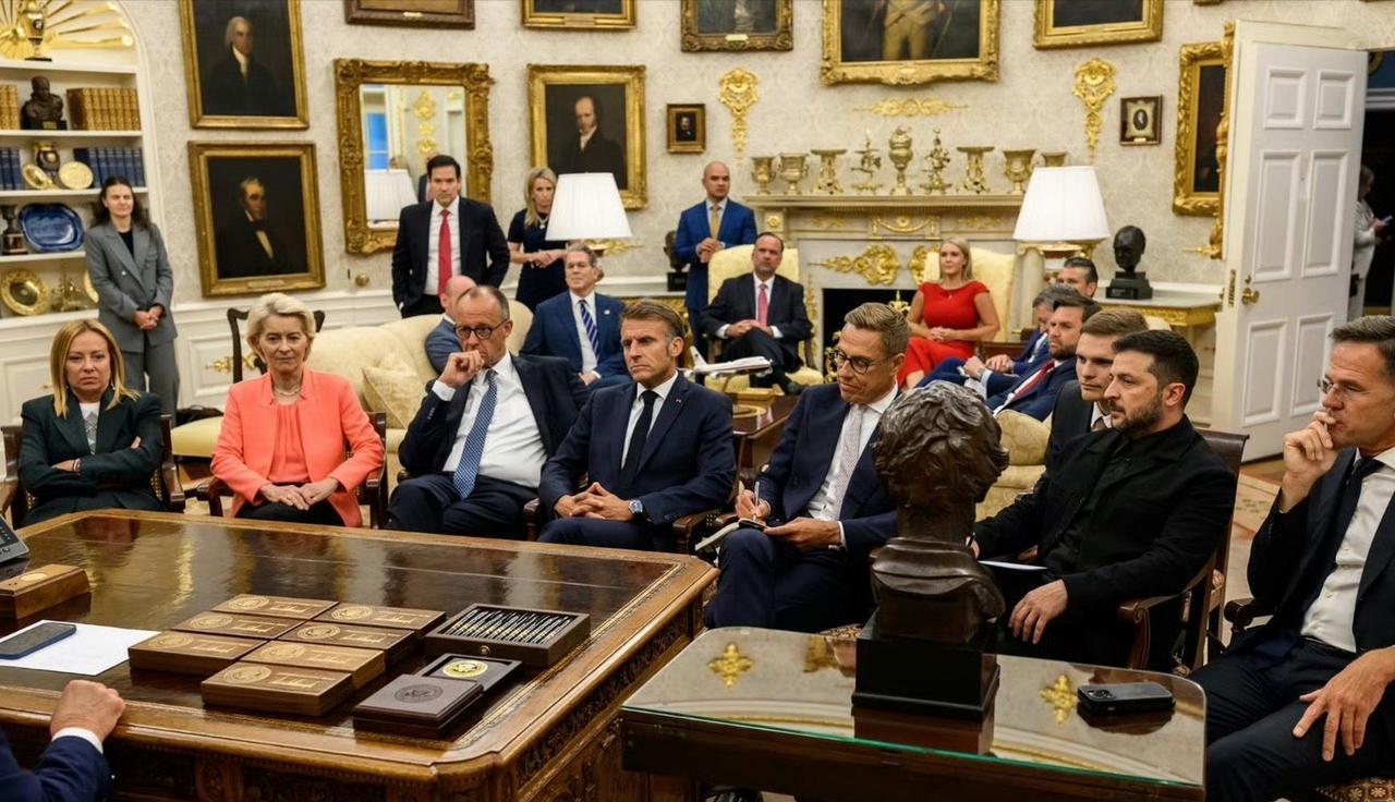 特朗普“上课”图片曝光!美国总统特朗普与泽连斯基单独会晤结束后,虽然与来访的欧洲七位领导人还举行了公开会议,但是由于会议时间较短、期间更是因为特朗普给普京打了40分钟的电话,所以特朗普在所有面对媒体的官方会晤结束后,又把欧盟主席冯德莱恩、北约秘书长吕特、法国总统马克龙和泽连斯基等人领进了白宫椭圆形办公室来了一次集体“上课”,从白宫方面刚刚发布的最新照片不难看出,欧洲7名领导人如同学生一般正在听特朗普“讲课”、画面相当和谐。目前,相关照片已经引发热议,不少西方网友直接嘲讽欧洲7位领导人和泽连斯基一样,在白宫都被特朗普耍的团团转,而且看起来没有任何尊严可言。