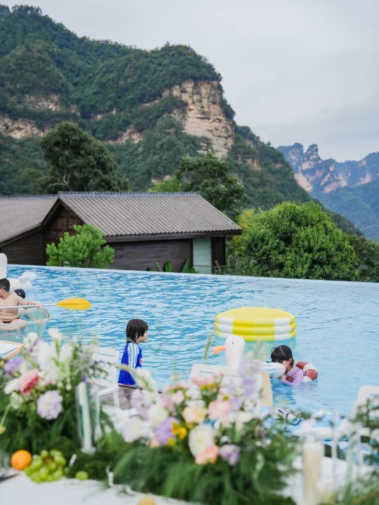 孩子们跳进蓝色无边泳池里嬉笑打闹,游泳、划船、打水枪,直到天黑也不知疲倦。