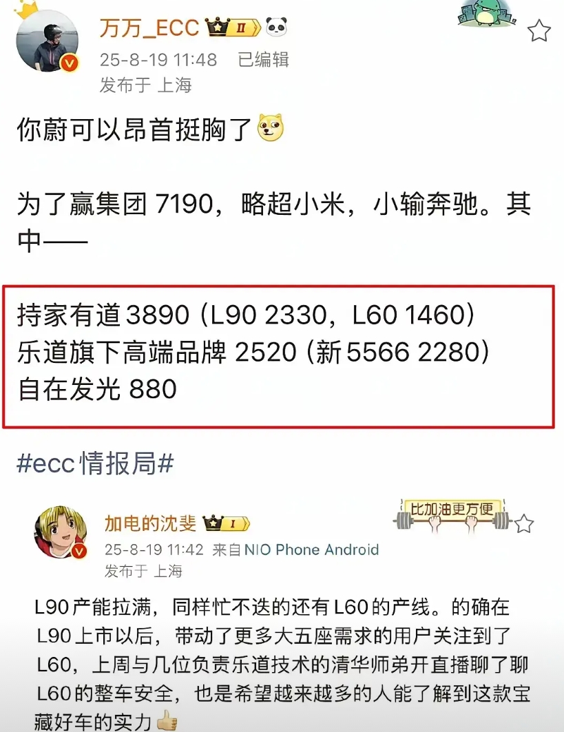 乐道雄起,但蔚来落寞了,各方信息显示上周蔚来集团销售7190辆,乐道品牌销售38