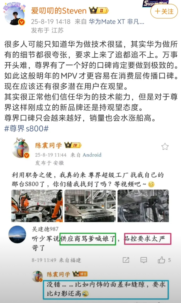 看来,奇瑞曾经经历过的现在江淮也正在经历,汽车博主兼尊界车主陈震同学到尊界超级工厂亲自监工自己的爱车生产后称,尊界在品控上的要求之高,就连内饰的面差和缝隙,标准都比劳斯莱斯幻影还严格。博主孙少军也在直播中爆料,尊界严苛的品控,也让供应商面临巨大压力,甚至出现“骂爹喊娘”的情况。 作为车评领域的大V,陈震同学在尊界工厂亲自参观生产流程,并监工了自己的尊界座驾的生产环节后坦诚承认,尊界是目前他所开过的中国品牌汽车中,最接近劳斯莱斯闪灵行驶质感的,没有之一! 奇瑞汽车董事长尹总曾经说过,奇瑞刚开始和华为合作智界品牌时,团队很不适应,因为华为的品控比德国人还严苛。当时,很多人都以为尹总只是出于恭维余承东才这样说的,可现在博主陈震亲自走了一趟尊界工厂后,也不得不承认,华为的品控真的如奇瑞尹总所说的那么严苛。 这种极致严苛的品控,一方面彰显出华为打造高端汽车品牌、追求卓越品质的决心,不妥协于任何细节,势要在高端汽车市场树立标杆;另一方面,也让我们看到中国汽车品牌在与科技巨头深度融合后,正以全新的高标准、严要求,向世界顶尖汽车品质发起冲击,有望推动中国汽车工业在高端领域实现突破,为消费者带来更具竞争力的产品。