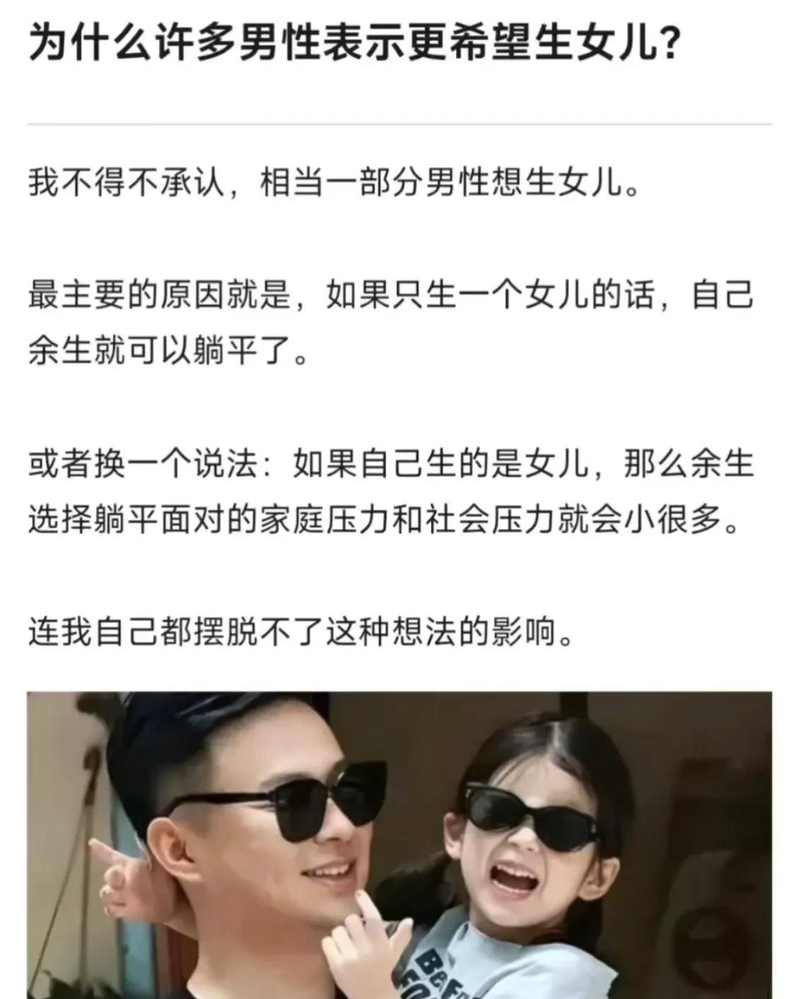 准确的说法是为什么男人在第一胎是男孩地情况下,第二胎更希望生女儿! 我敢说目前大部分的父母还是希望第一胎是男孩,不论是父亲还是母亲都是这个想法。可以看看现在的男光棍的数量绝对比剩女的数量多,那就说明还是男孩生得比女孩多,这是社会原因造成的结果。 也有人说现在这个时代男的不值钱,女的地位高。除非少数家里有矿的需要儿子继承,普通人也没啥继承的。所以说任何事情没有绝对的对与错,只要是自己的孩子管他男孩女孩,都会尽力去养育他们!