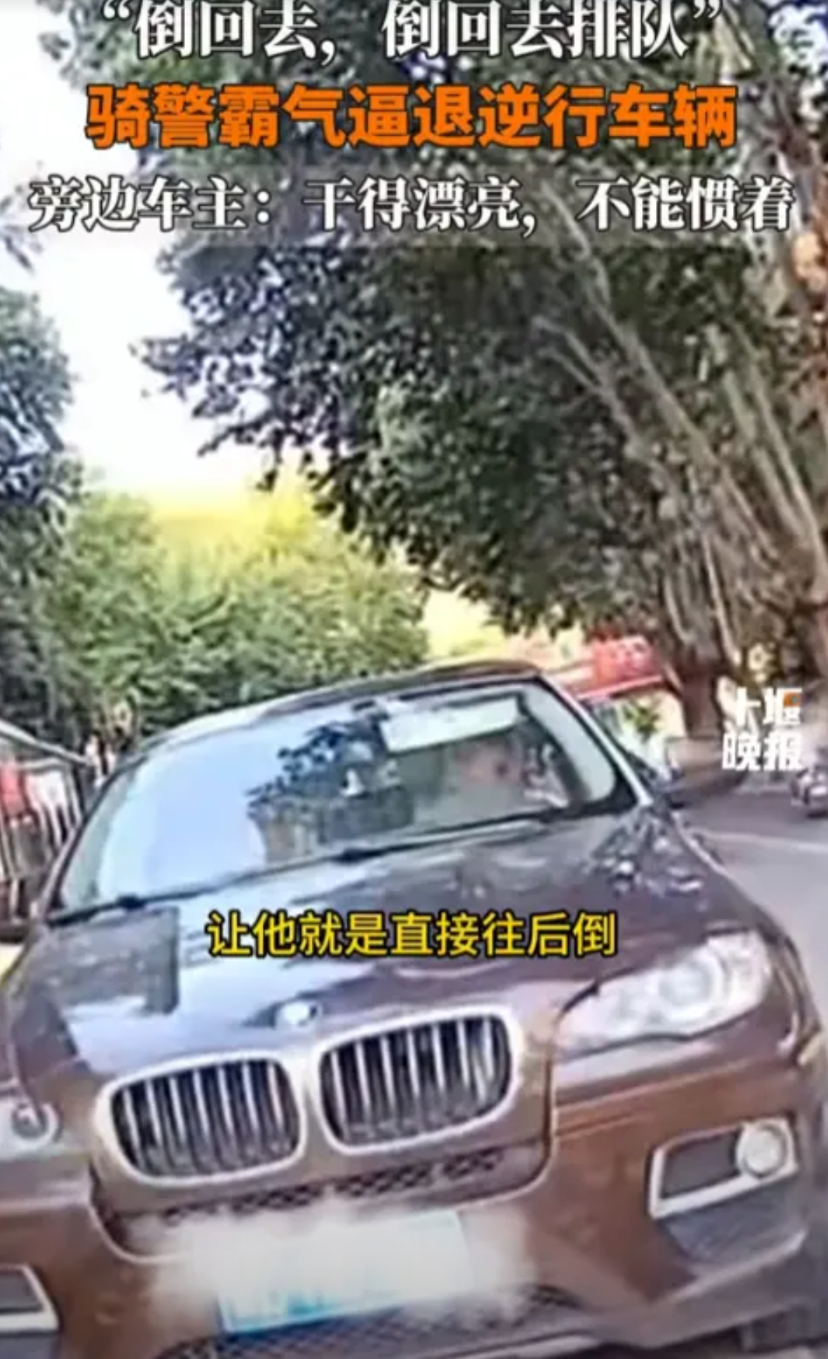 说时迟那时快,正在附近指挥的交警骑着摩托车就过来了,这位交警也不啰嗦,隔着老远就朝着宝马车喊:“倒回去,倒回去排队”,声音洪亮,透着一股不容置疑的劲儿。