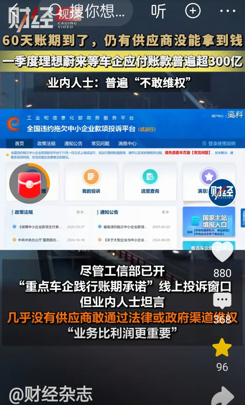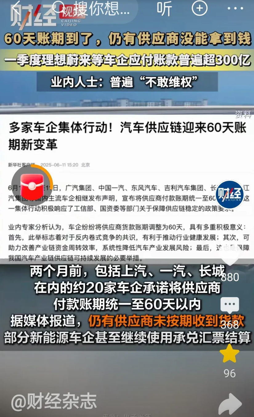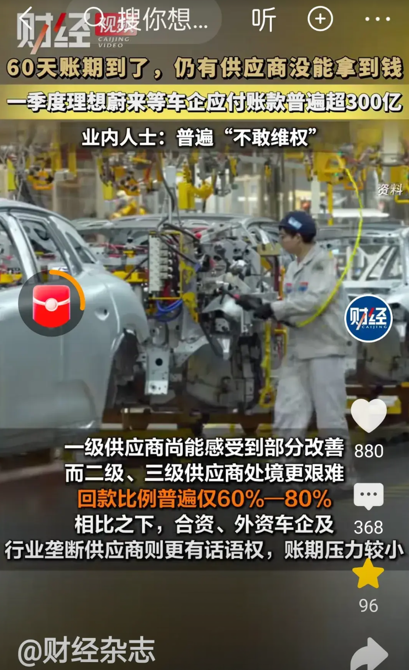这就是汽车供应商的无奈啊! 根据《财经》报道,60天账期到了,汽车供应商还没拿到钱,两个月前,工信部将供应商付款时限控制在60天内,以保障供应商的资金链安全。很多车企也积极响应了,但是理想,蔚来等车企今年一季度的应付账款普遍超过300亿,供应商们也有怒不敢言,不敢得罪车企,毕竟还有应收账款,要是投诉了车企,以后就没有车企的订单,日子更难熬。这个结怎么解? 还得靠法律的力量来敦促这些车企践行承诺。