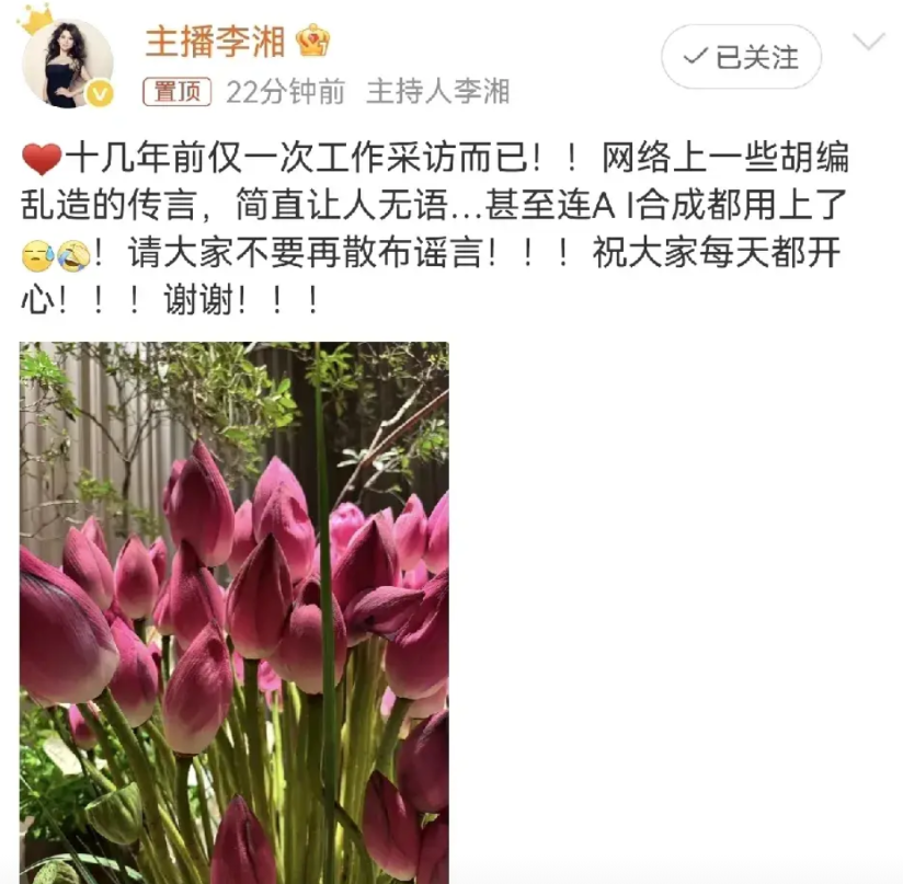接着,李湘还怒斥了网络上的谣言,称这些都是胡编乱造的传言,简直让人无语。为了达到抹黑的目的,甚至有人用AI合成来达到传播谣言的目的。