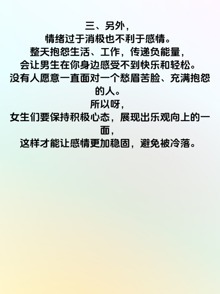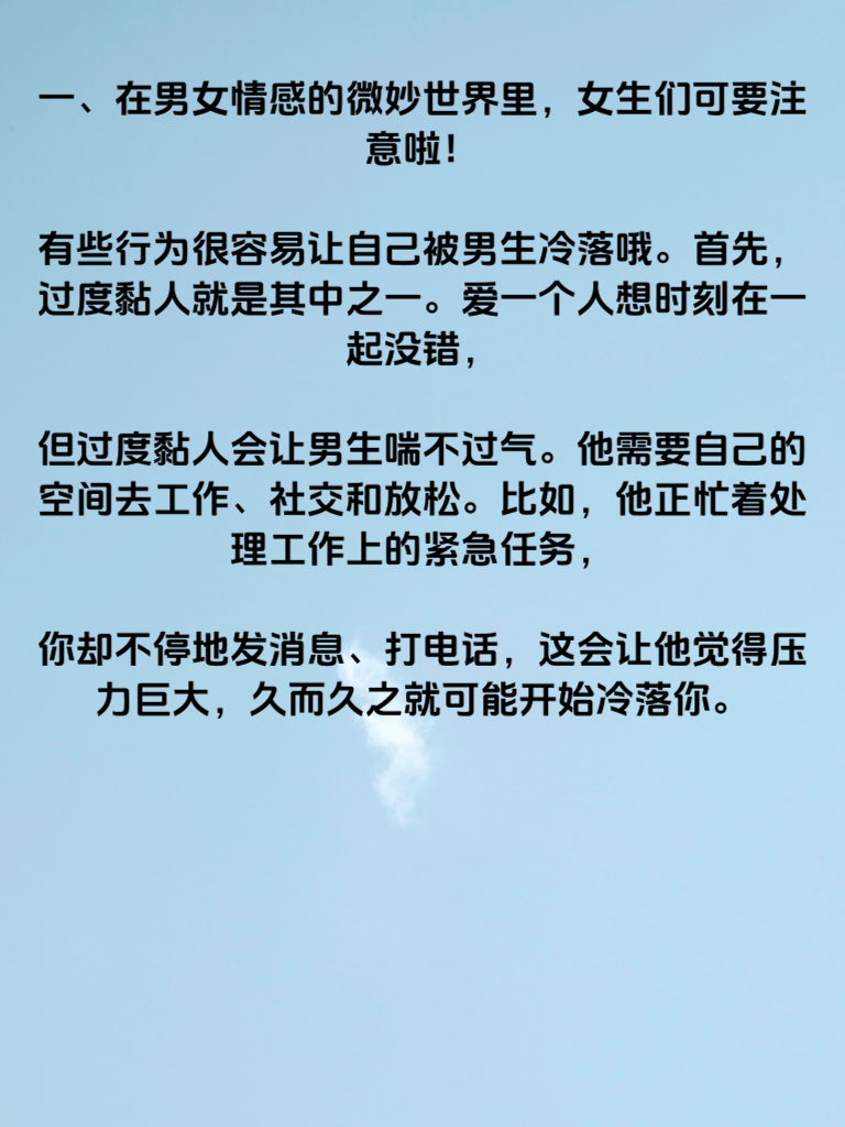 一、在男女情感的微妙世界里,女生们可要注意啦!有些行为很容易让自己被男生冷落哦。首先,过度黏人就是其中之一。爱一个人想时刻在一起没错,但过度黏人会让男生喘不过气。他需要自己的空间去工作、社交和放松。比如,他正忙着处理工作上的紧急任务,你却不停地发消息、打电话,这会让他觉得压力巨大,久而久之就可能开始冷落你。 二、还有,总是无端猜疑也会带来糟糕后果。没有证据的怀疑,会让男生觉得你不信任他。比如,他和同事正常吃个饭,你就追问不停,甚至查看他手机,这会让他觉得自己毫无隐私和自由,从而对你心生厌烦,逐渐冷落你。 三、另外,情绪过于消极也不利于感情。整天抱怨生活、工作,传递负能量,会让男生在你身边感受不到快乐和轻松。没有人愿意一直面对一个愁眉苦脸、充满抱怨的人。所以呀,女生们要保持积极心态,展现出乐观向上的一面,这样才能让感情更加稳固,避免被冷落。