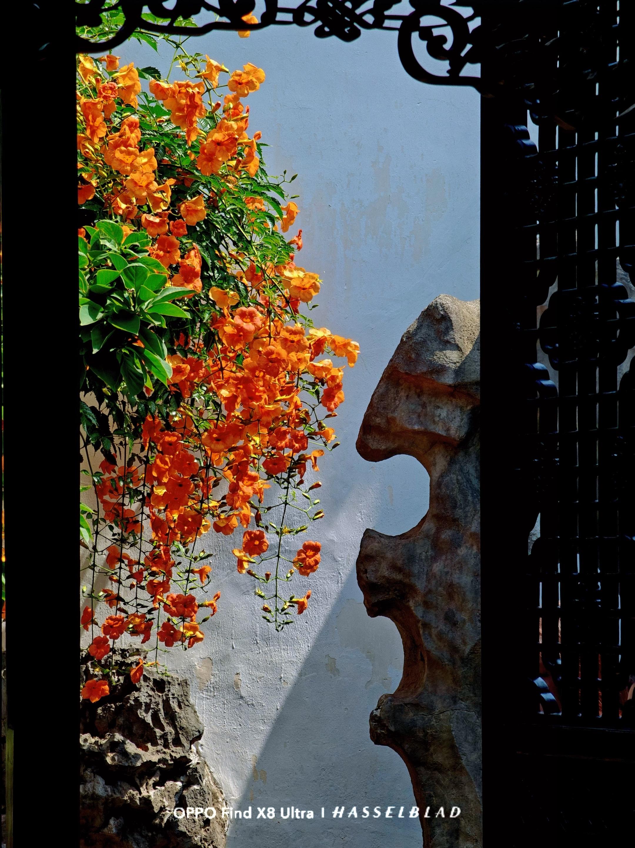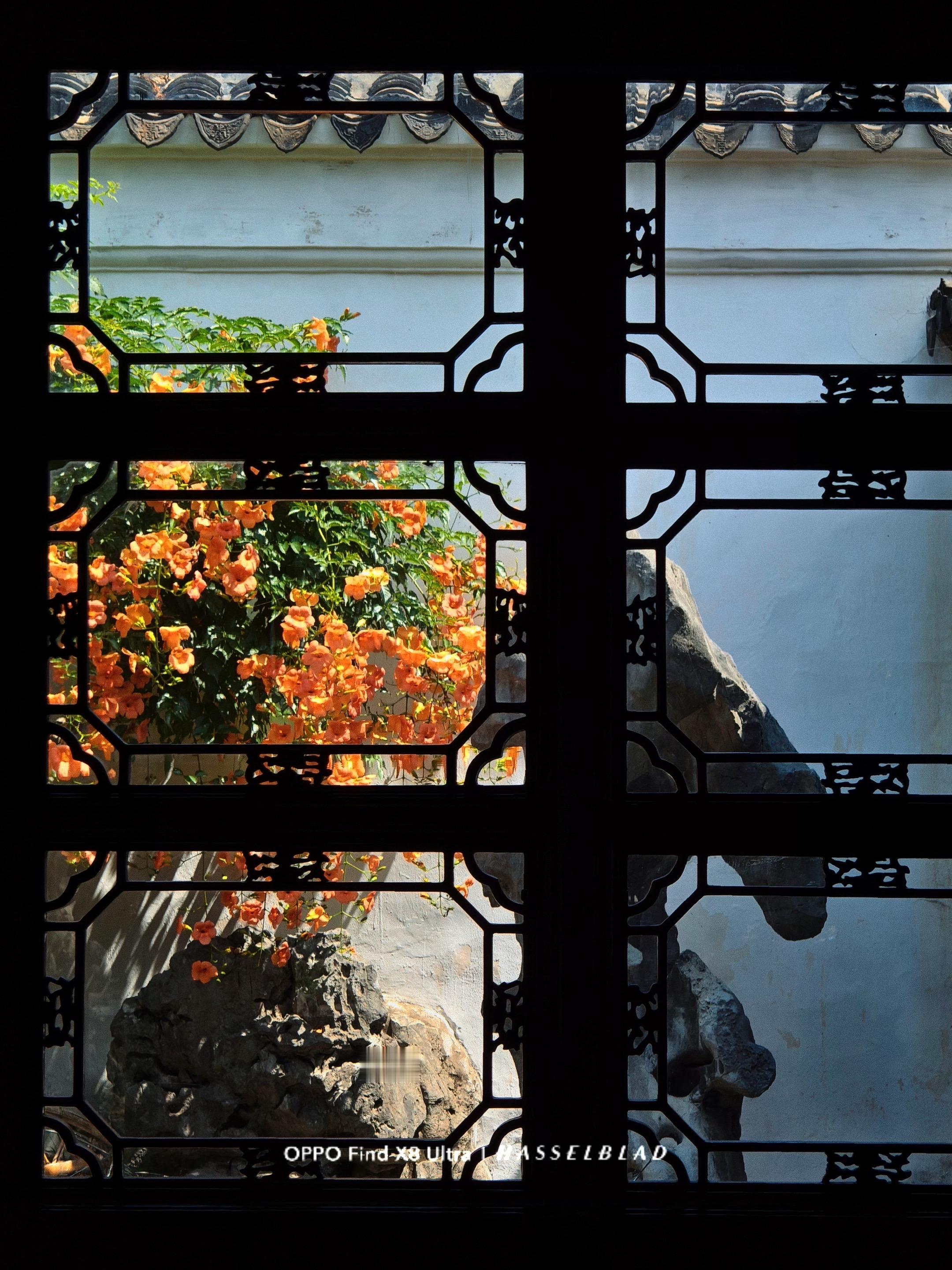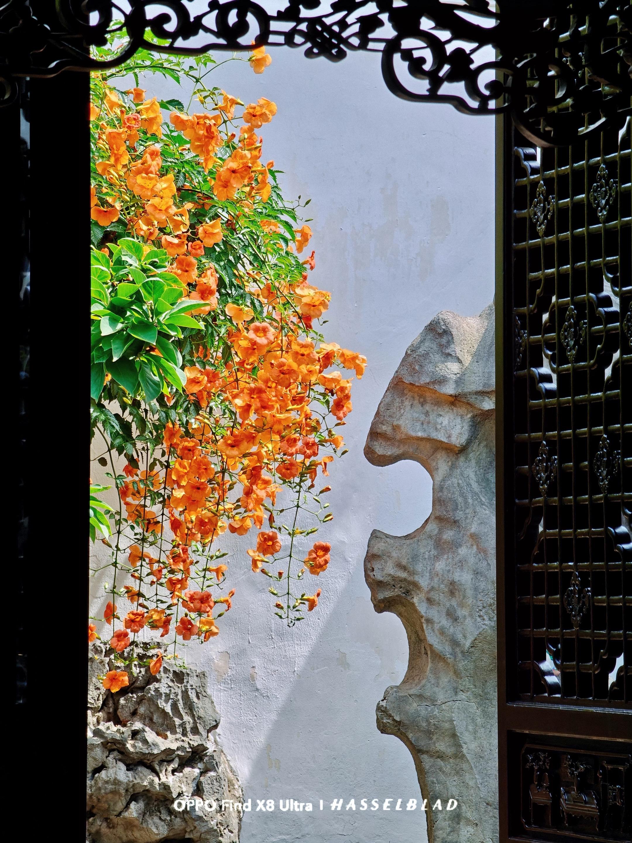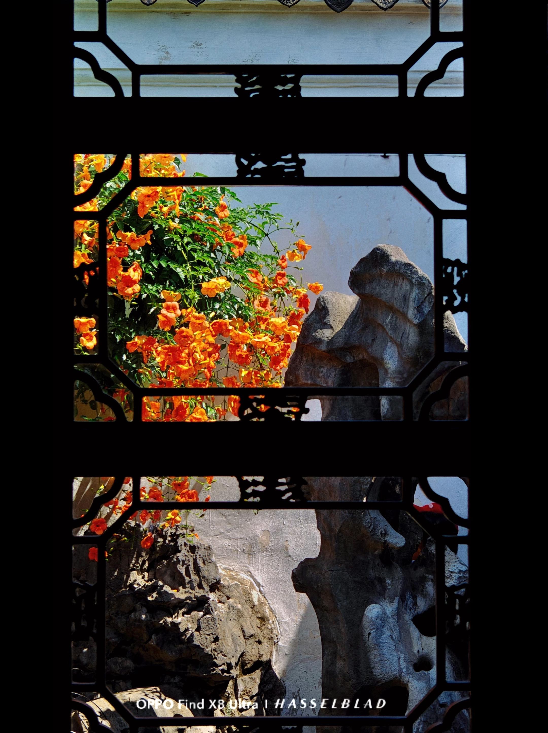 经典的“窗中式”构图:将雕花木窗作为前景框架,焦点对准窗后的凌霄花。窗框的深色能完美衬托花的艳丽,形成强烈的视觉集中感。