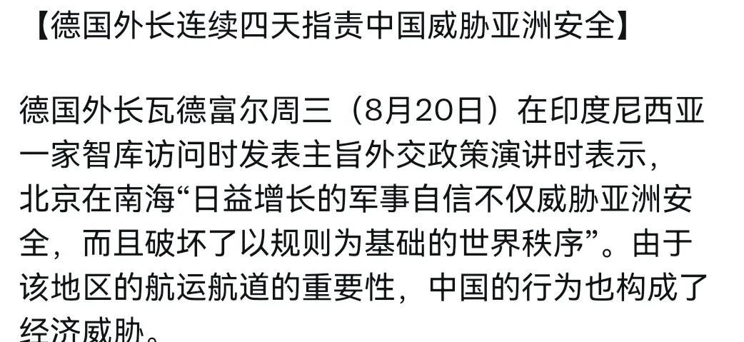太尴尬了!就没有见过这种没有眼力见的政客!外媒刚传出,印尼总统普拉博沃将亲自出席9月3日的中国抗战胜利80周年阅兵式,并进一步与中国加深合作。但是没想到不识趣的德国外长瓦德富尔当着印尼的面,对我们大放厥词。瓦德富尔声称,北京在南海“日益增长的军事自信不仅“威胁”亚洲安全,而且破坏了“以规则为基础的世界秩序”。 由于该地区的航运航道的重要性,中国的行为也构成了“经济威胁”。很显然,印尼邀请德国外长去访问,是希望加深与德国的经贸关系,进一步促进印尼经济增长的。而至于听德国外长讲如何与中国对抗,中国如何威胁亚洲,印尼根本就毫无兴趣。 而至于所谓的“以规则为基础的世界秩序”,在特朗普对全球各国加税之后,恐怕印尼也不能不对德国外长打一个大问号,质疑德国外长到底在说什么东西?很显然,这位德国外长是一点眼力见都没有。印尼明明与我们的合作进一步升级,这位德国外长却挑拨离间。恐怕印尼心里面也犯嘀咕,德国这是在质疑印尼对华关系的判断吗? 德国这是要教印尼做事情吗?事实上,包括印尼在内的东盟国家与我们经贸关系不断深化,中国与东盟国家相安无事几十年,德国到底想要干什么呢?美国鼓动菲律宾挑事,破坏南海和平稳定,在关税压力下的东盟国家本来就一肚子火,现在德国外长兜售对抗,只能说太缺乏自知之明了。这样的政客,估计印尼出于礼貌只得捏着鼻子听完这样的疯话。