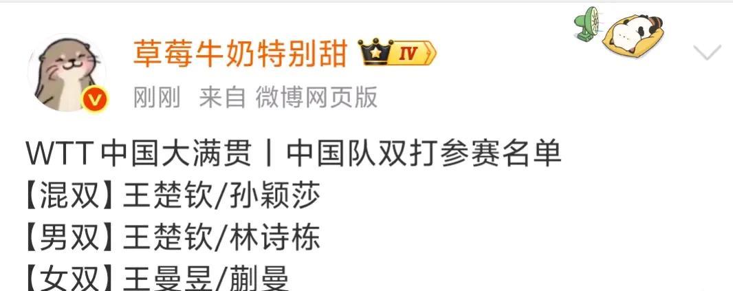 楚钦有在认真训练中。 虽然这次瑞典大满贯赛王楚钦没有参赛,但是他也有在体总训练馆里认真训练,牛冠凯陪着他练球。这次男队去了四个教练,不过孙逊没有跟赛,肖导没在北京,看到孙逊在旁边看王楚钦训练了。 有网友说还以为楚钦要准备北大研究生入学呢,没想到还在认真练球中,横滨冠军赛他输给了张本智和,这段时间肯定又要拼命抡拍子了。瑞典大满贯赛,还有乒超第三阶段的比赛,楚钦应该也要去参赛。 刚刚看到9月份的中国大满贯赛参赛名单出来了,王楚钦又要身兼三项:男单、男双、混双,虽然很想看莎头的混双,但是又不想他们太累了。接下来的乒超第三阶段比赛,楚钦加油哦!