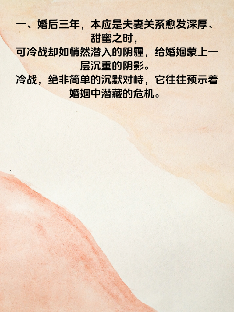一、婚后三年,本应是夫妻关系愈发深厚、甜蜜之时,可冷战却如悄然潜入的阴霾,给婚姻蒙上一层沉重的阴影。冷战,绝非简单的沉默对峙,它往往预示着婚姻中潜藏的危机。 二、冷战的出现,可能源于生活琐事的日积月累。比如家务分担不均,一方长期过度劳累,心中不满却又隐忍,最终在某件小事上爆发冷战。也可能是沟通出现了严重问题,双方不再坦诚交流内心想法,误解越积越多。 三、面对冷战,绝不能坐视不管。夫妻双方都要勇敢迈出第一步,主动打破沉默。可以选择一个温馨的环境,心平气和地坐下来,真诚地表达自己的感受和想法。倾听对方时,不要急于辩解,给予对方充分表达的机会。 四、同时,要学会换位思考。站在对方角度看问题,理解对方的压力与委屈。平日里多留意对方的情绪变化,及时给予关心和支持。只有这样,才能化解冷战危机,让婚姻重回温暖正轨。