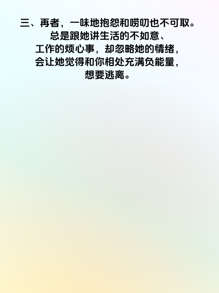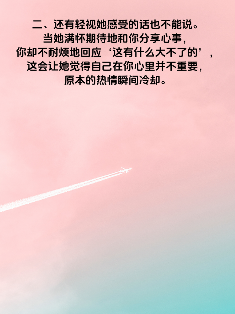 一、在男女相处中,当发现女心渐行渐远时,有些话千万不能讲。比如那些带有指责意味的话语,像‘你怎么总是这样’‘你就不能改改吗’,这类话只会让她心生反感,觉得你在挑剔她,从而进一步拉开彼此的距离。 二、还有轻视她感受的话也不能说。当她满怀期待地和你分享心事,你却不耐烦地回应‘这有什么大不了的’,这会让她觉得自己在你心里并不重要,原本的热情瞬间冷却。 三、再者,一味地抱怨和唠叨也不可取。总是跟她讲生活的不如意、工作的烦心事,却忽略她的情绪,会让她觉得和你相处充满负能量,想要逃离。 四、另外,拿她和别人比较的话更是禁忌。说‘你看看人家谁谁谁’,这会严重伤害她的自尊心,让她陷入自我怀疑,对你的好感也会荡然无存。要知道,每个女生都渴望被独一无二地对待,尊重她、理解她,才能让她的心重新靠近你。
