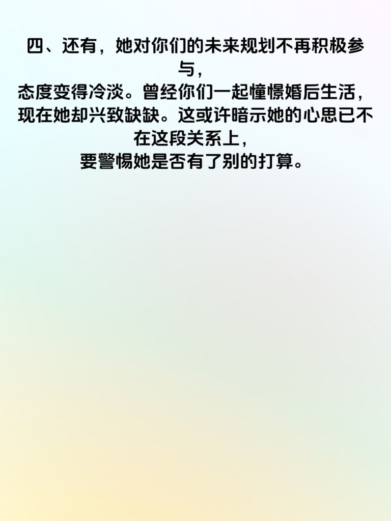 一、婚前,当你察觉到一些神秘信号时,内心难免会涌起不安。她是否隐藏着出轨风险?这是许多准新郎心中纠结的疑问。其实,一些看似细微的变化,可能暗藏玄机。 二、比如,她突然开始频繁地加班,且对工作细节闭口不谈。以往她会和你分享职场趣事,现在却总是含糊其辞。这有可能是她在工作之外,有了新的情感牵扯,加班或许只是借口。 三、再者,她的手机变得异常神秘,总是不离身,甚至接电话都要避开你。以前她对你毫无保留,现在却有了明显的界限。这时候,你要冷静观察,旁敲侧击地了解情况,但别一味指责,以免适得其反。 四、还有,她对你们的未来规划不再积极参与,态度变得冷淡。曾经你们一起憧憬婚后生活,现在她却兴致缺缺。这或许暗示她的心思已不在这段关系上,要警惕她是否有了别的打算。 五、面对这些神秘信号,不要盲目猜测,也别冲动行事。找个合适的时机,坦诚地和她沟通,表达你的担忧与爱意。通过真诚的交流,或许能解开谜团,避免在婚前留下隐患。