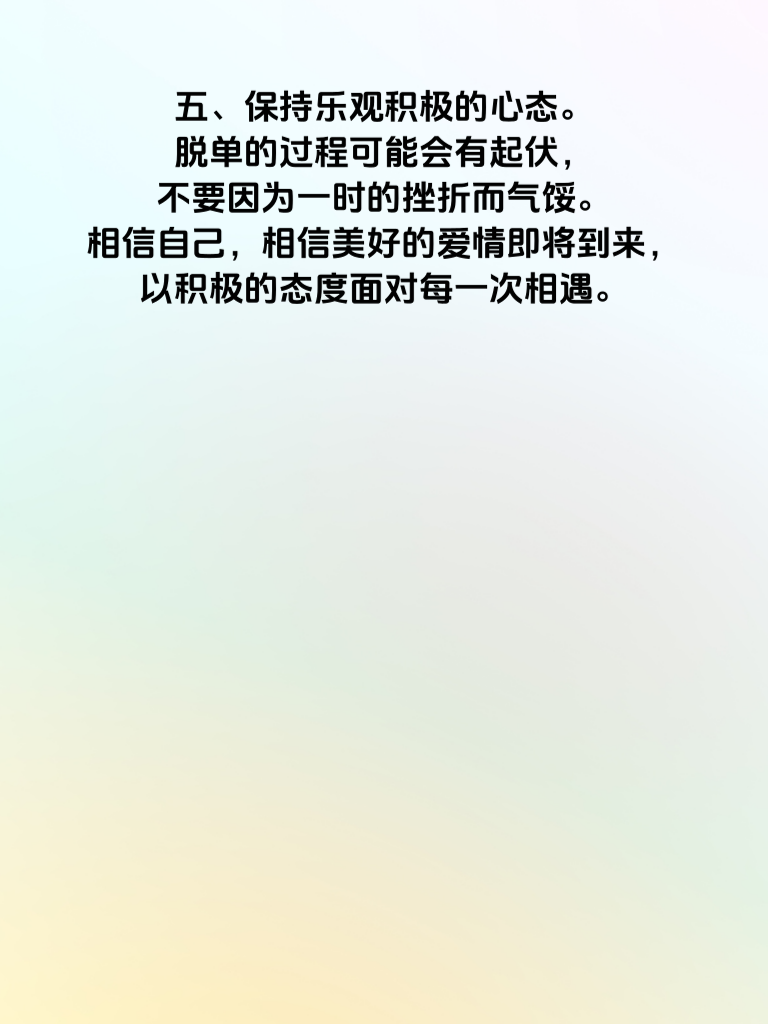 一、属鼠的朋友们,下半年脱单秘籍来啦!首先,要积极拓展社交圈。走出自己的舒适区,参加各种兴趣活动、聚会等,在新环境中结识更多的异性。 二、展现真实的自己。真诚是打动人心的关键,不要刻意伪装。让对方看到你善良、有趣、有责任心的一面,这样更容易吸引到合适的人。 三、提升自身魅力。注重外在形象,保持整洁得体。同时,不断丰富内在,多读书、学习新技能,让自己变得更有内涵和智慧。 四、学会主动交流。不要害怕开口,主动与心仪的对象聊天,了解彼此的兴趣爱好、生活点滴,增进感情。 五、保持乐观积极的心态。脱单的过程可能会有起伏,不要因为一时的挫折而气馁。相信自己,相信美好的爱情即将到来,以积极的态度面对每一次相遇。