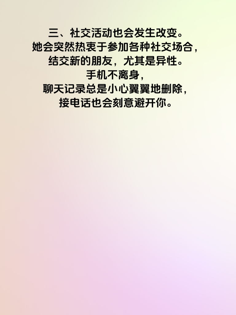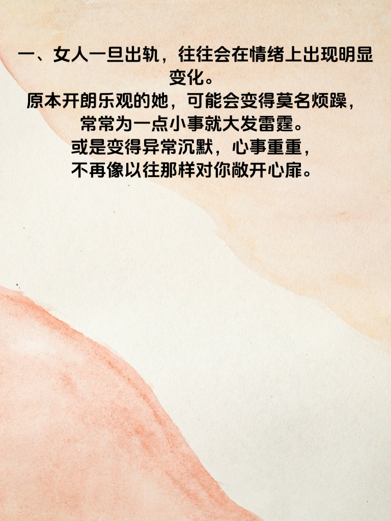 一、女人一旦出轨,往往会在情绪上出现明显变化。原本开朗乐观的她,可能会变得莫名烦躁,常常为一点小事就大发雷霆。或是变得异常沉默,心事重重,不再像以往那样对你敞开心扉。 二、在生活习惯方面,也会有迹可循。比如她开始注重打扮,频繁购买新衣服和化妆品,出门前会花费更多时间精心装扮。而且作息时间可能变得不规律,经常借口加班、聚会晚归。 三、社交活动也会发生改变。她会突然热衷于参加各种社交场合,结交新的朋友,尤其是异性。手机不离身,聊天记录总是小心翼翼地删除,接电话也会刻意避开你。 四、对亲密关系的态度同样会有转变。她不再像以前那样主动与你亲近,甚至会抗拒你的拥抱和亲吻。夫妻生活也变得敷衍,找各种理由推脱。 五、如果发现她有这些变化,不要一味指责,而是冷静沟通。以平和的态度问问她最近的感受,倾听她的想法,或许能从中找到问题的根源,避免感情走向更糟糕的结局。