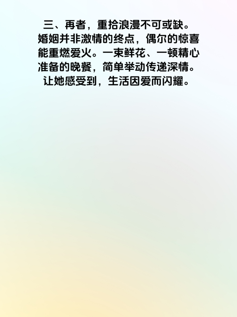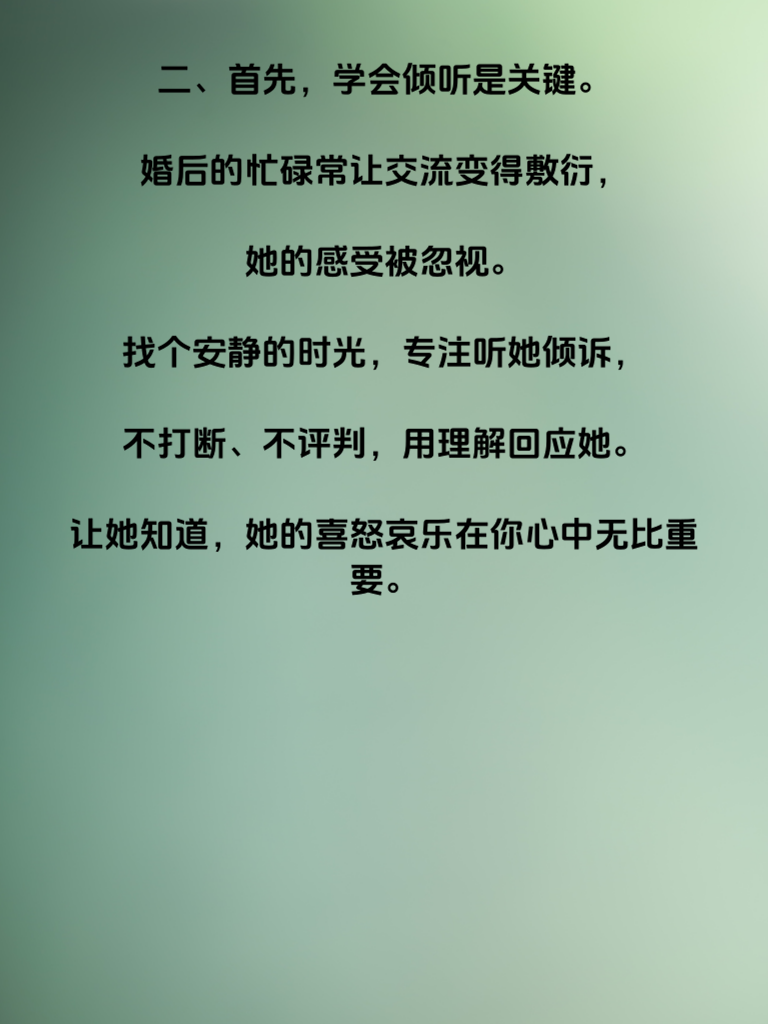 一、婚后生活,难免会遇到磕磕绊绊,让曾经亲密的她渐渐疏远。别慌,这里有三招助你挽回她的心。 二、首先,学会倾听是关键。婚后的忙碌常让交流变得敷衍,她的感受被忽视。找个安静的时光,专注听她倾诉,不打断、不评判,用理解回应她。让她知道,她的喜怒哀乐在你心中无比重要。 三、再者,重拾浪漫不可或缺。婚姻并非激情的终点,偶尔的惊喜能重燃爱火。一束鲜花、一顿精心准备的晚餐,简单举动传递深情。让她感受到,生活因爱而闪耀。 四、最后,给予空间与尊重。婚后各自有圈子,别过度束缚。支持她的兴趣爱好,让她自由绽放。当她感受到信任与尊重,心会再次向你靠近。运用这三招,用心经营,定能挽回你的她,重拥幸福婚姻。